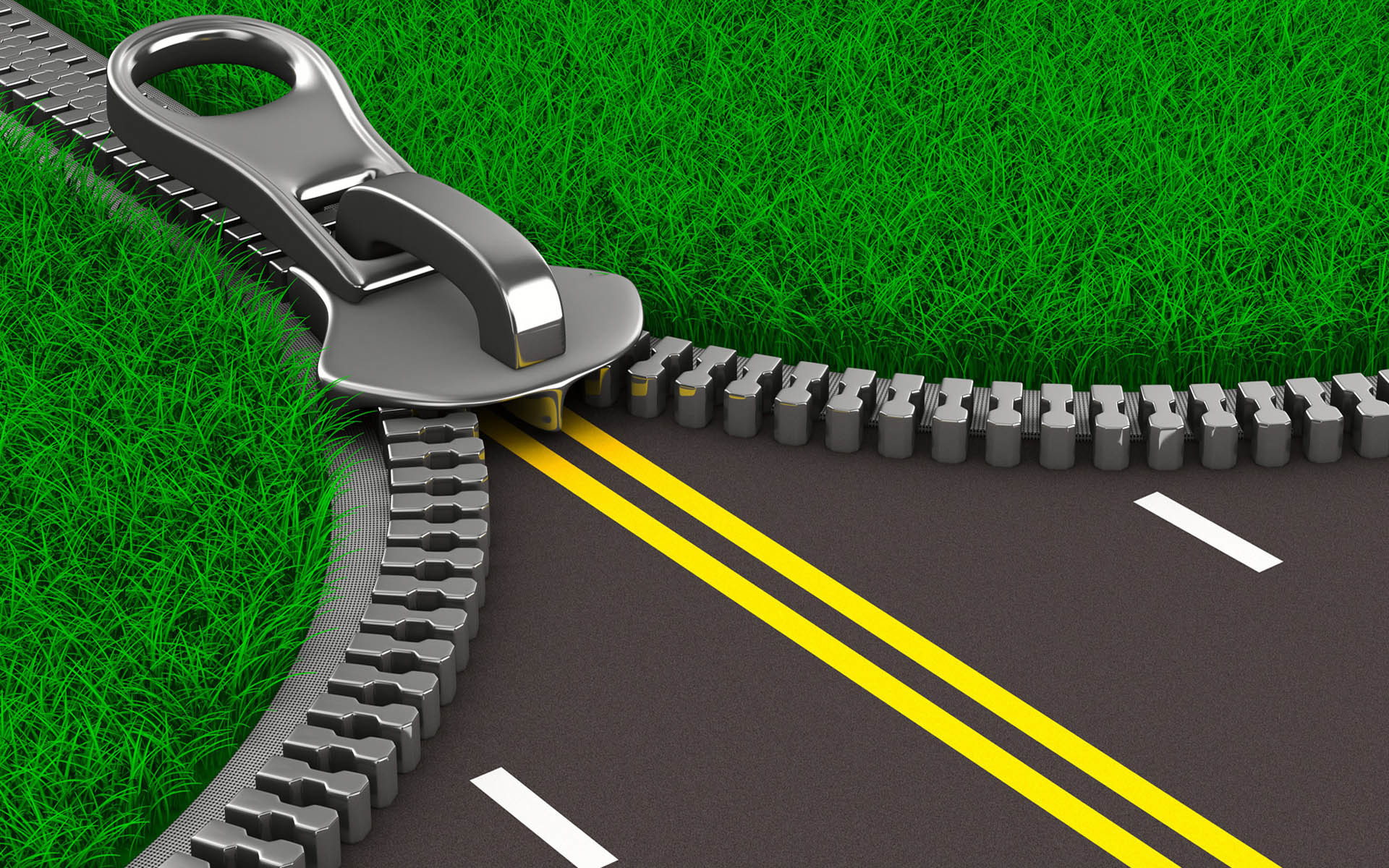 Description: A pair of scissors cutting through a road with grass on both sides of it and a yellow line on the other side.