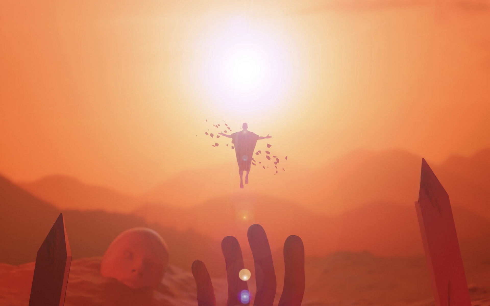 Description: A person holding up a pair of scissors in front of a sunset with a person on the other side of the image.