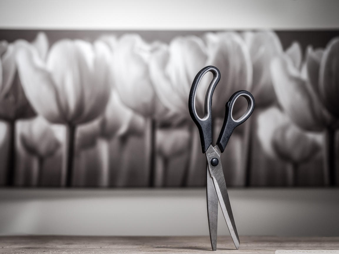 Description: A pair of scissors sitting on top of a table next to a wall with tulips on it.