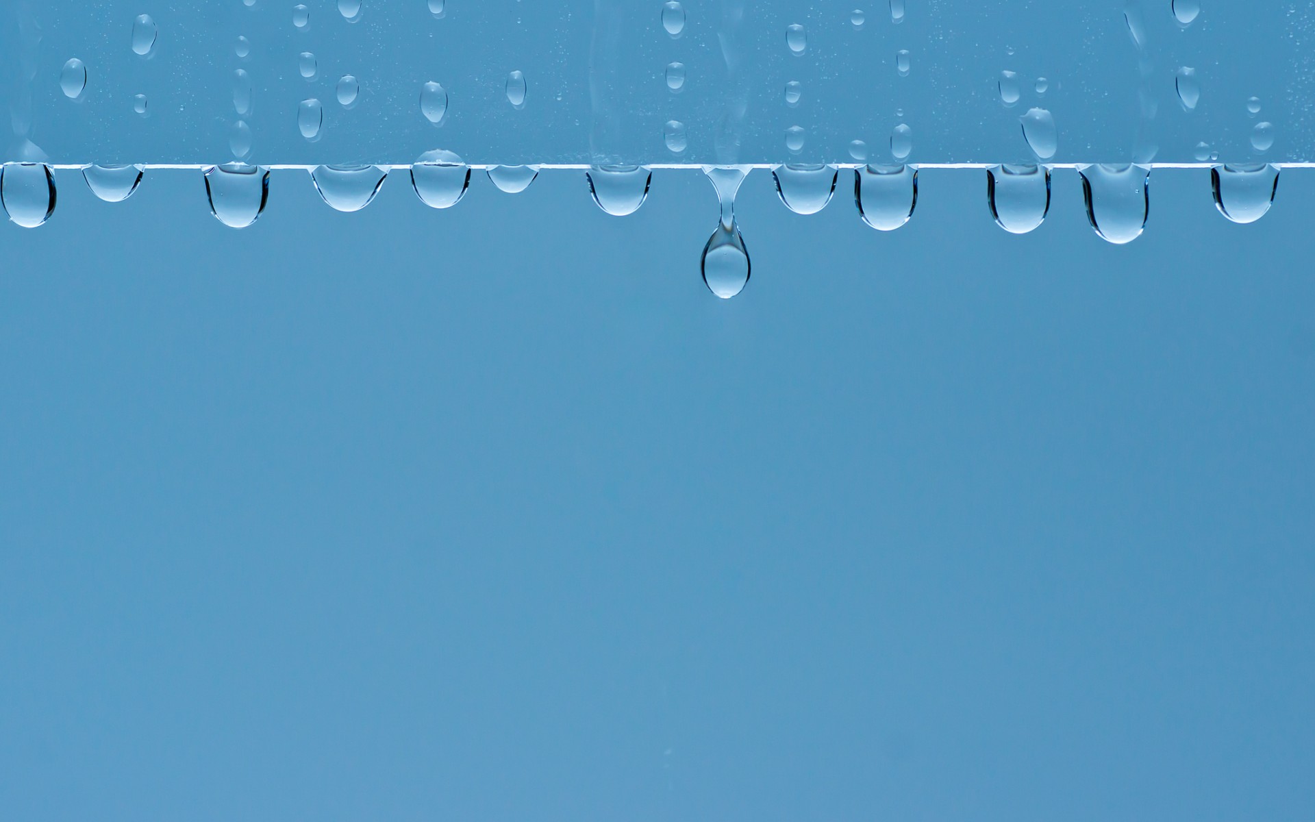 Description: A pair of scissors hanging from a line of water droplets on a blue background with a sky background behind.