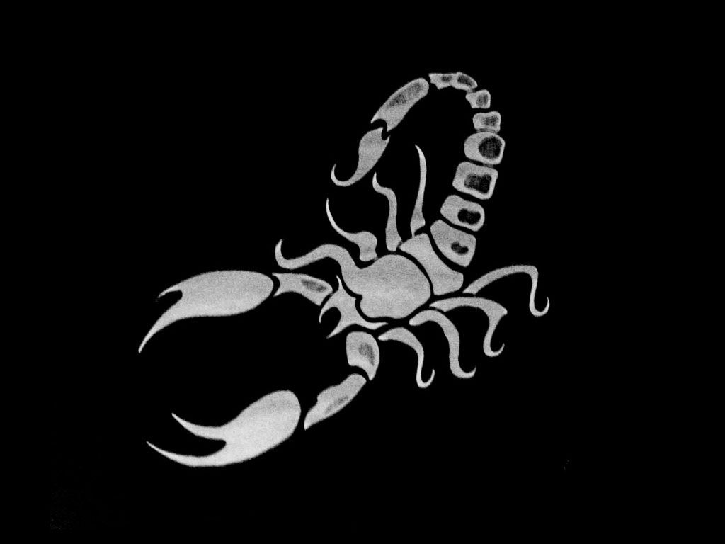 Description: A scorpion tattoo on a black background with a white outline of a scorpion on it's back side.