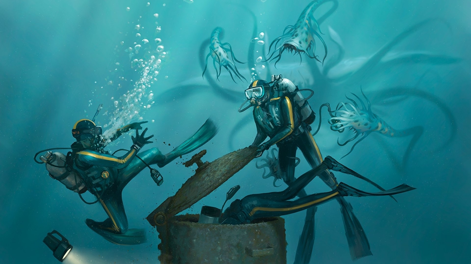 Description: A couple of people in scuba suits diving in the ocean with a large fish in the water behind them.