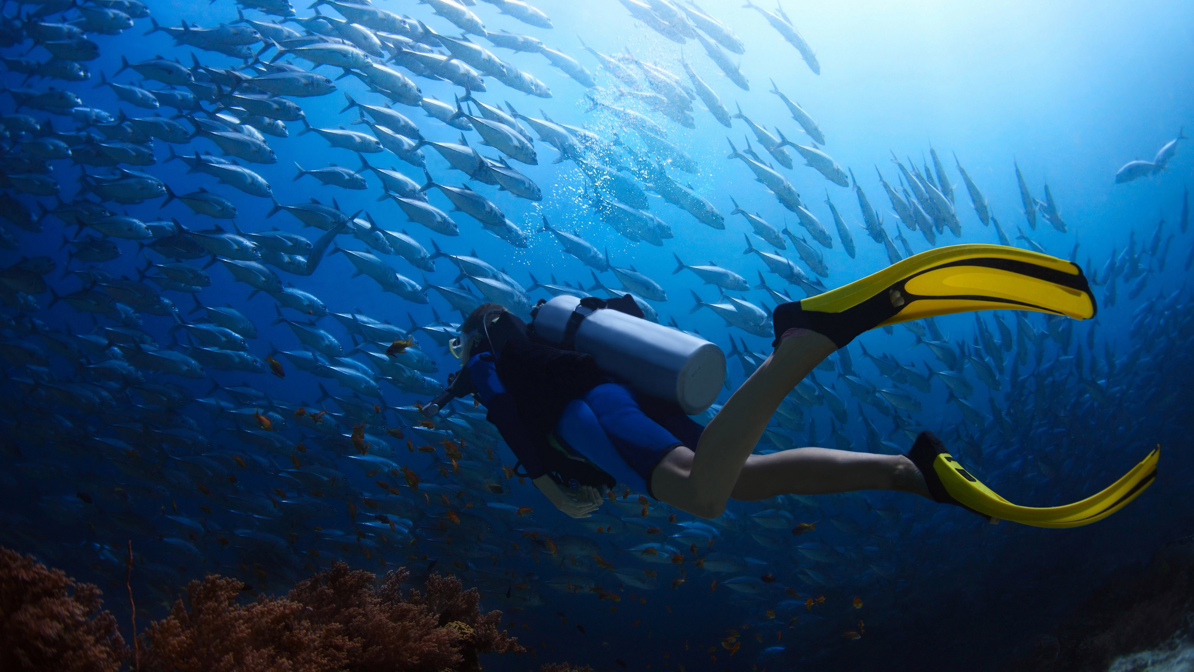 Description: A person in a scuba suit is swimming in the ocean with a large school of fish behind them and a scuba mask.