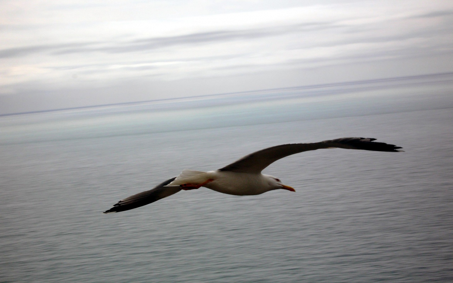 Description: A seagull flying over the ocean on a cloudy day with a red beak and black wings.