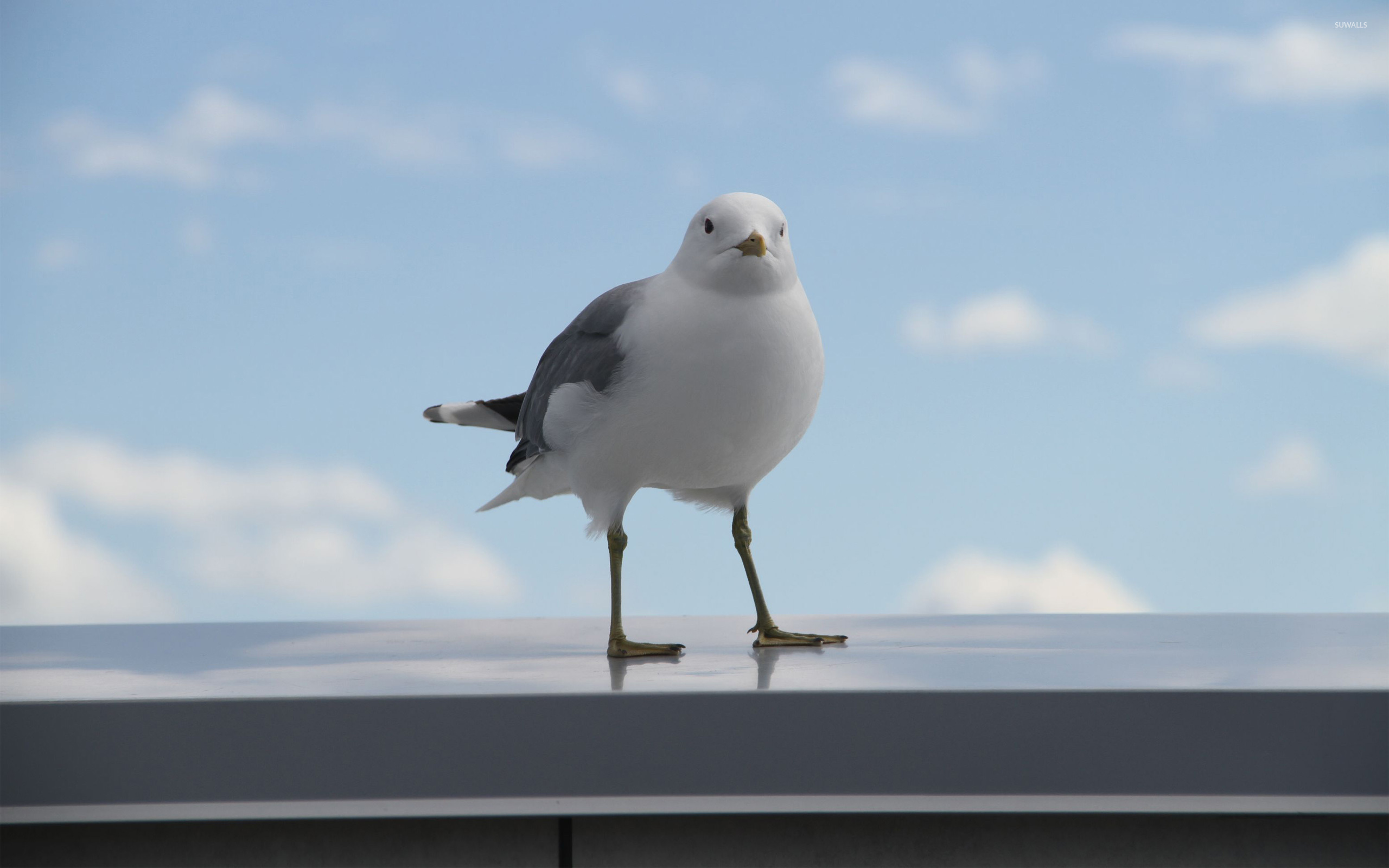 Description: A seagull standing on a roof with its legs crossed and head turned to the side.
