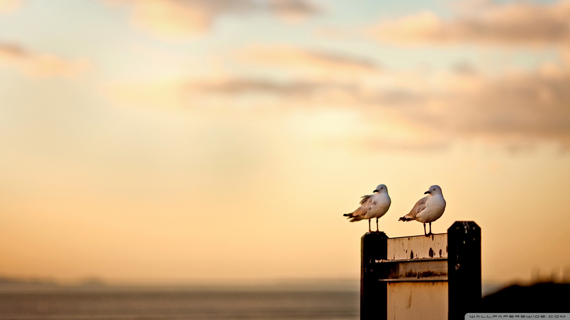 Description: Two seagulls sitting on a post at the beach at sunset or dawn with clouds in the background.