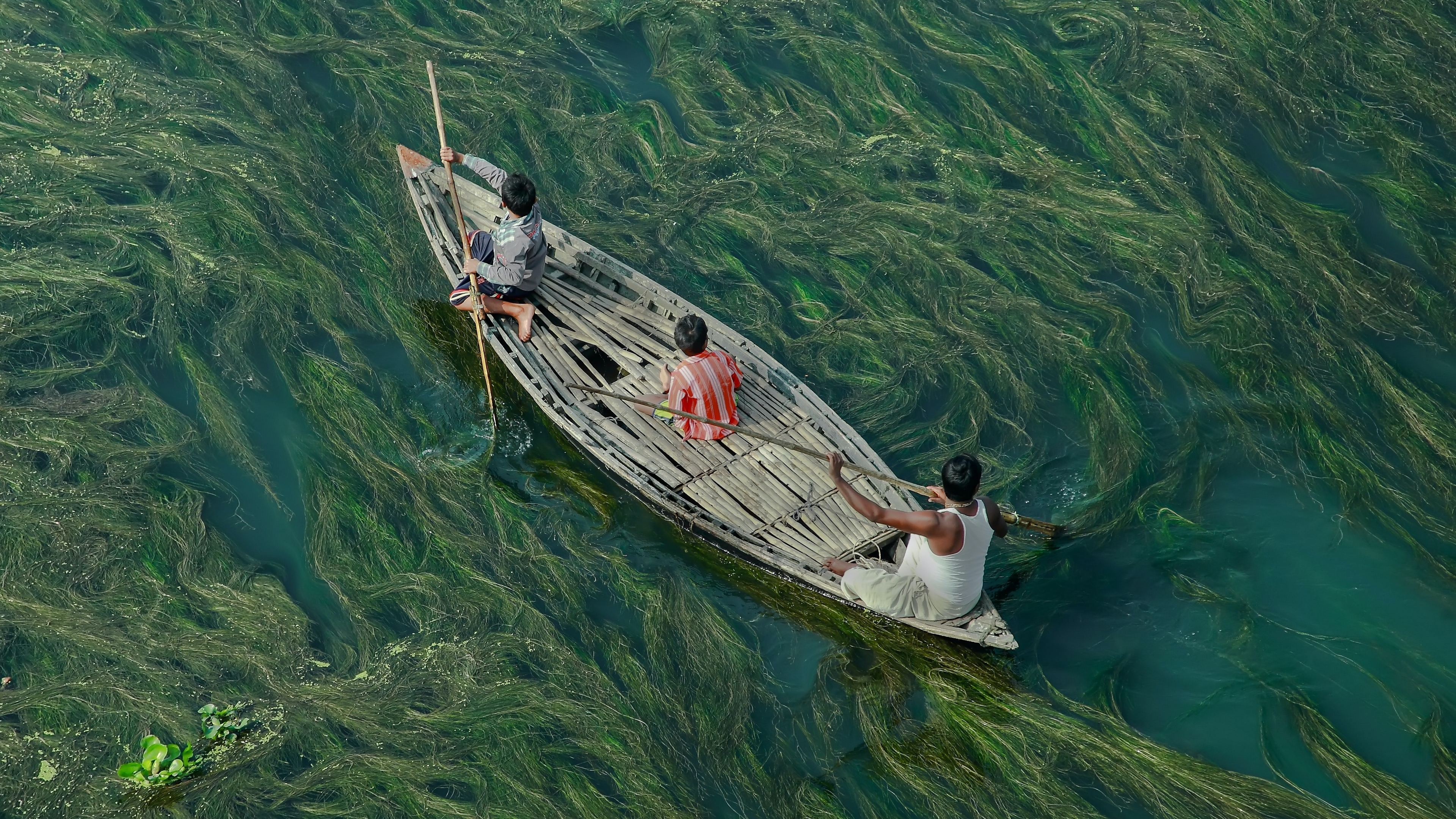 Description: Two people in a boat surrounded by seaweed in the water with a sky background and a long line of fish.
