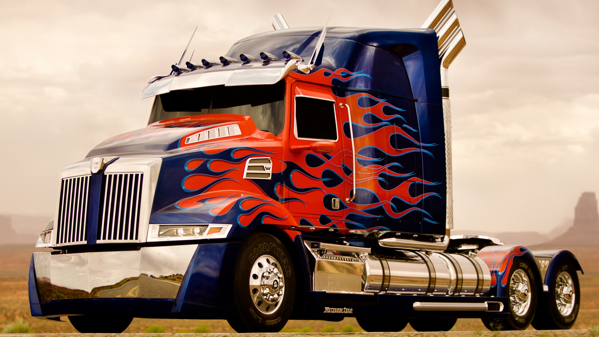 Description: A large semi truck with a flame painted on the side of it's face and hood is driving down a road.