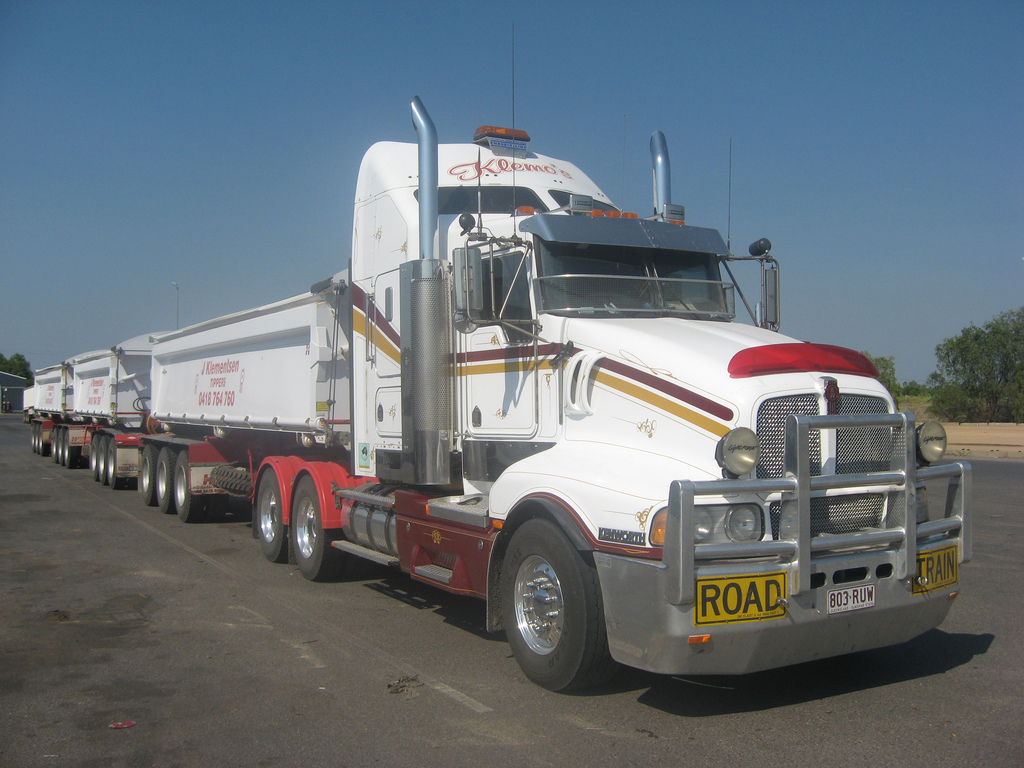 Description: A semi truck with a trailer is parked on the side of the road in a parking lot with a blue sky in the background.