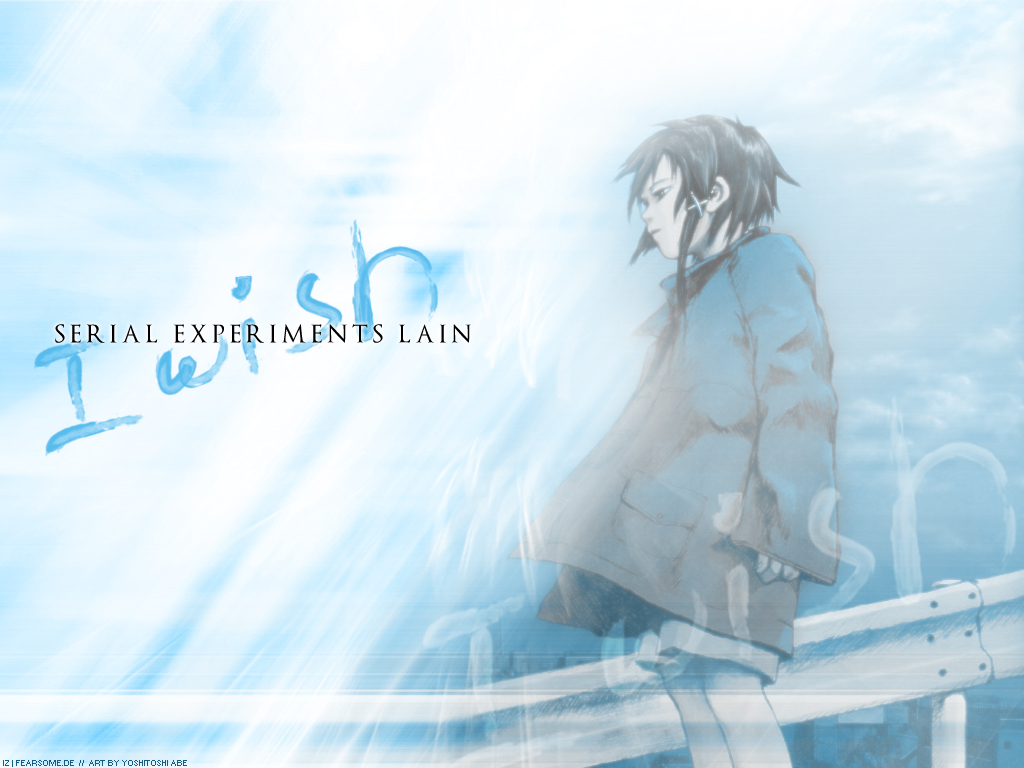 Description: A man sitting on a fence with a blue background and a white background with the words serial experiment is lain.