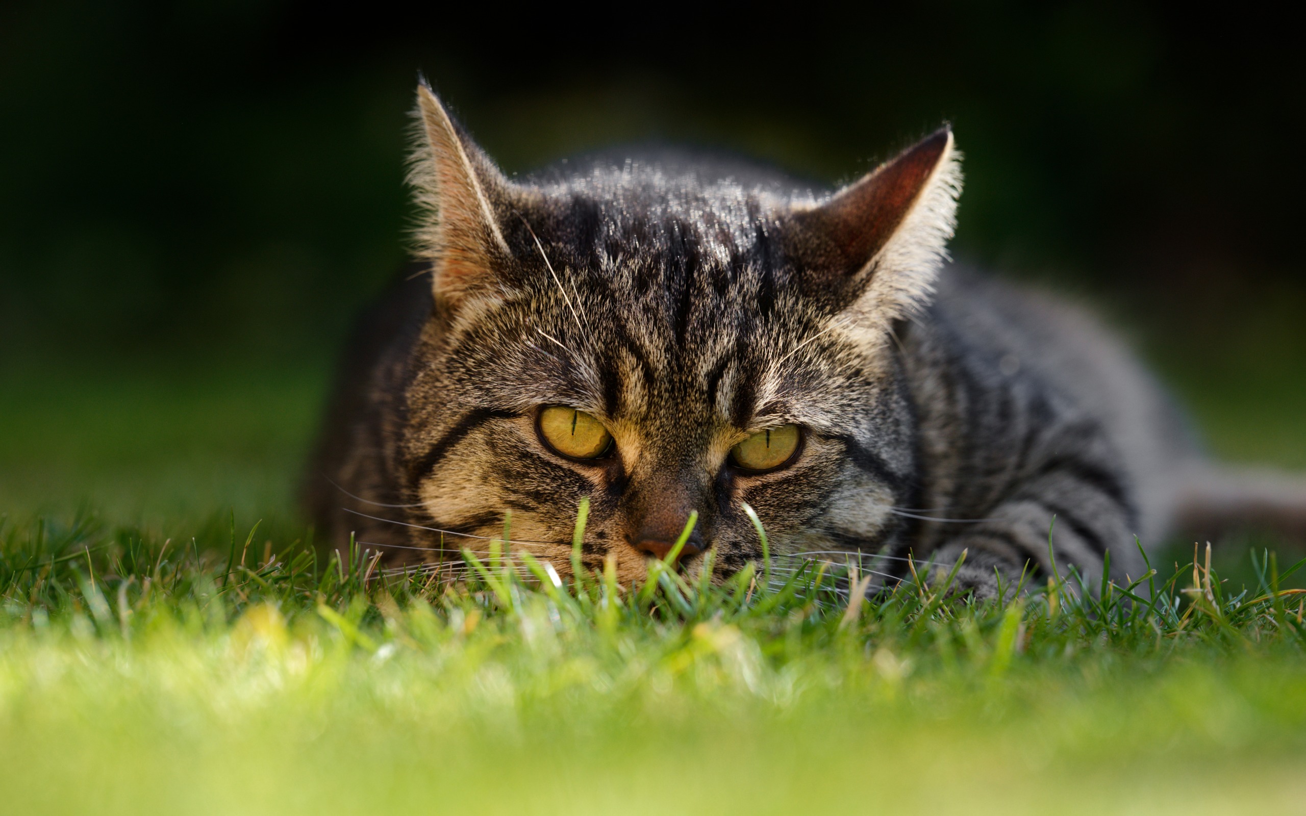 Description: A cat laying in the grass with its eyes open and looking at the camera with a serious look on its face.