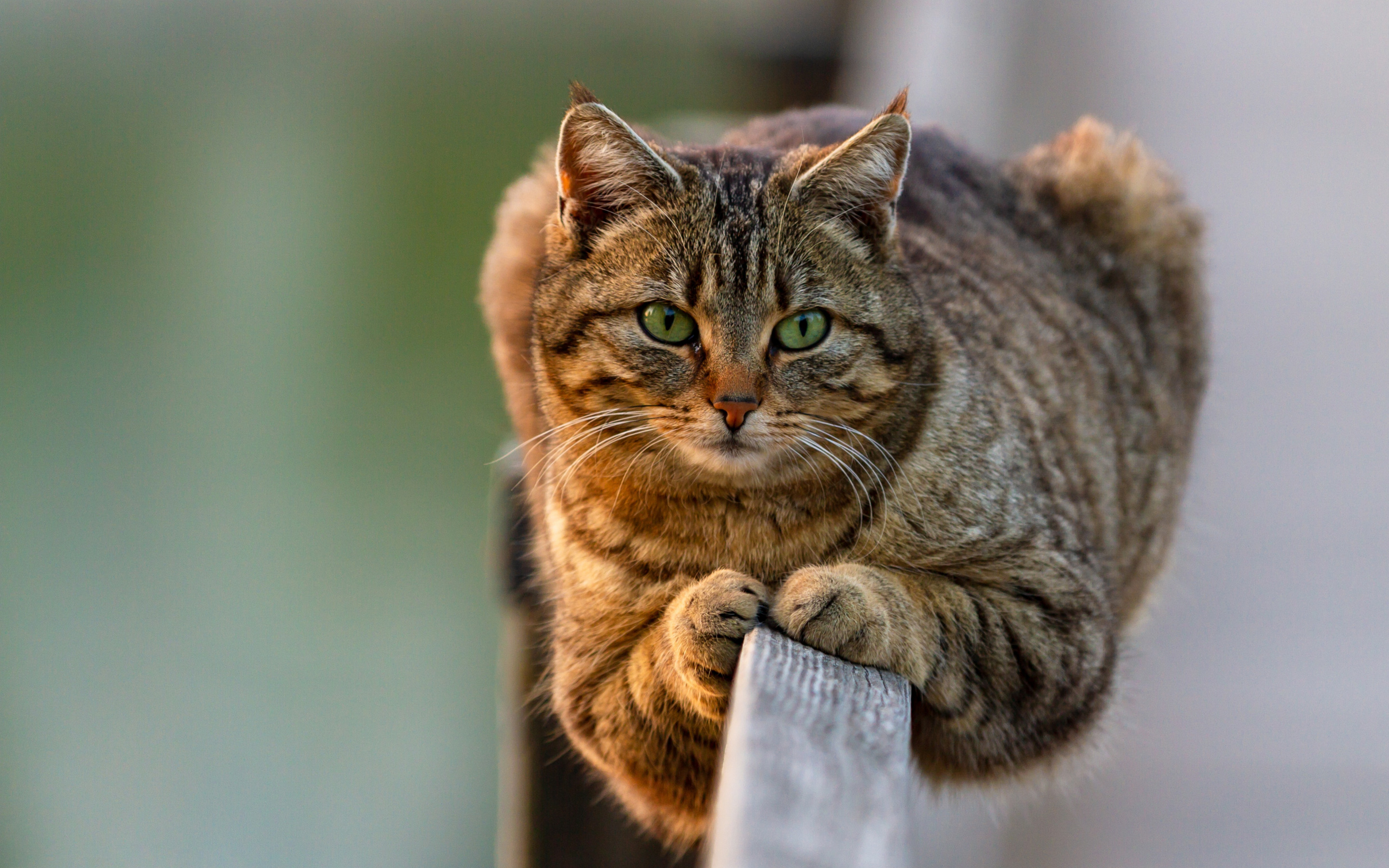 Description: A cat is standing on a rail looking at the camera with a serious look on its face and eyes.