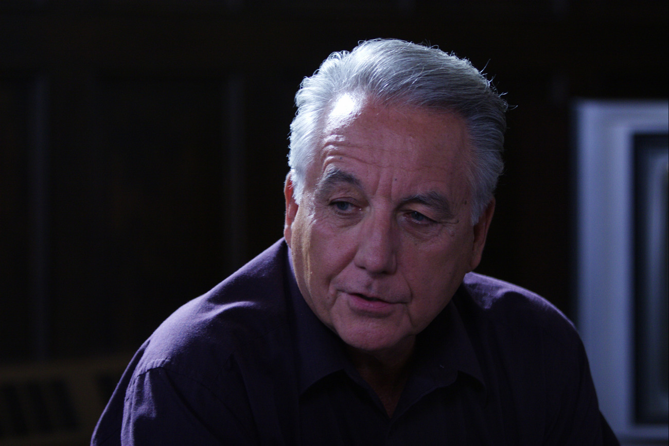Description: A man with a serious look on his face looking at something in the distance with a dark background and a window in the background.