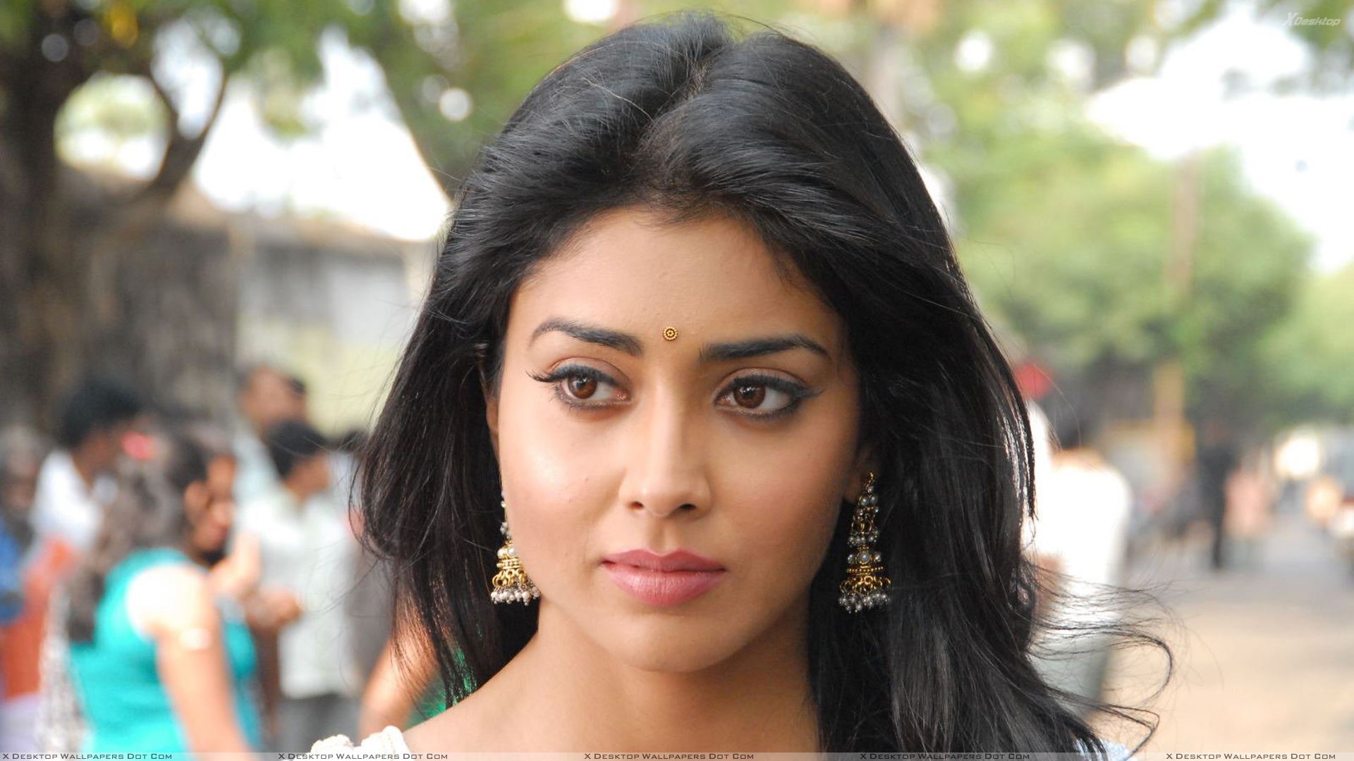 Description: A woman with long black hair and a white top is looking at the camera with a serious look on her face.