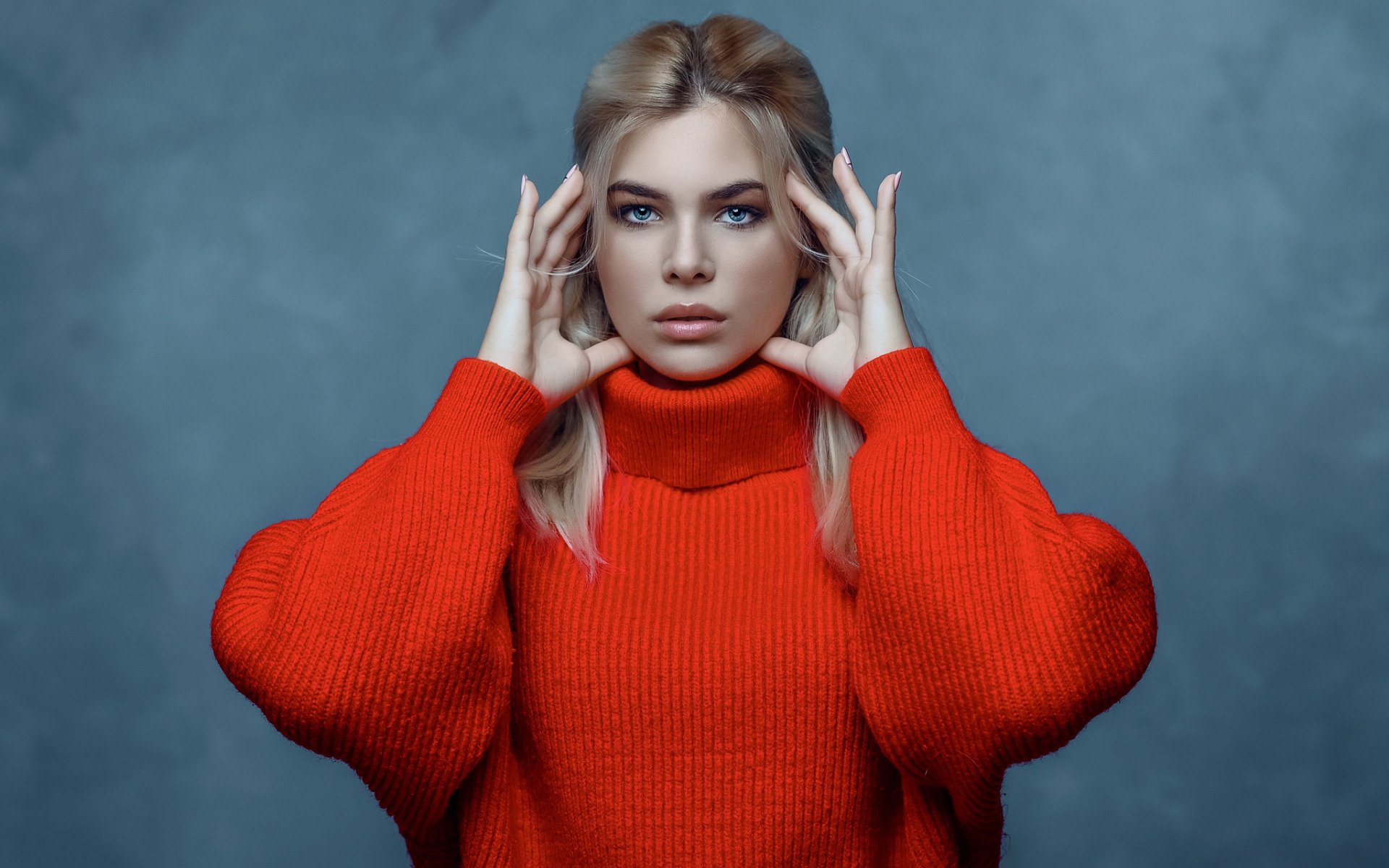 Description: A woman in a red sweater is holding her hands to her head and looking at the camera with a serious look on her face.