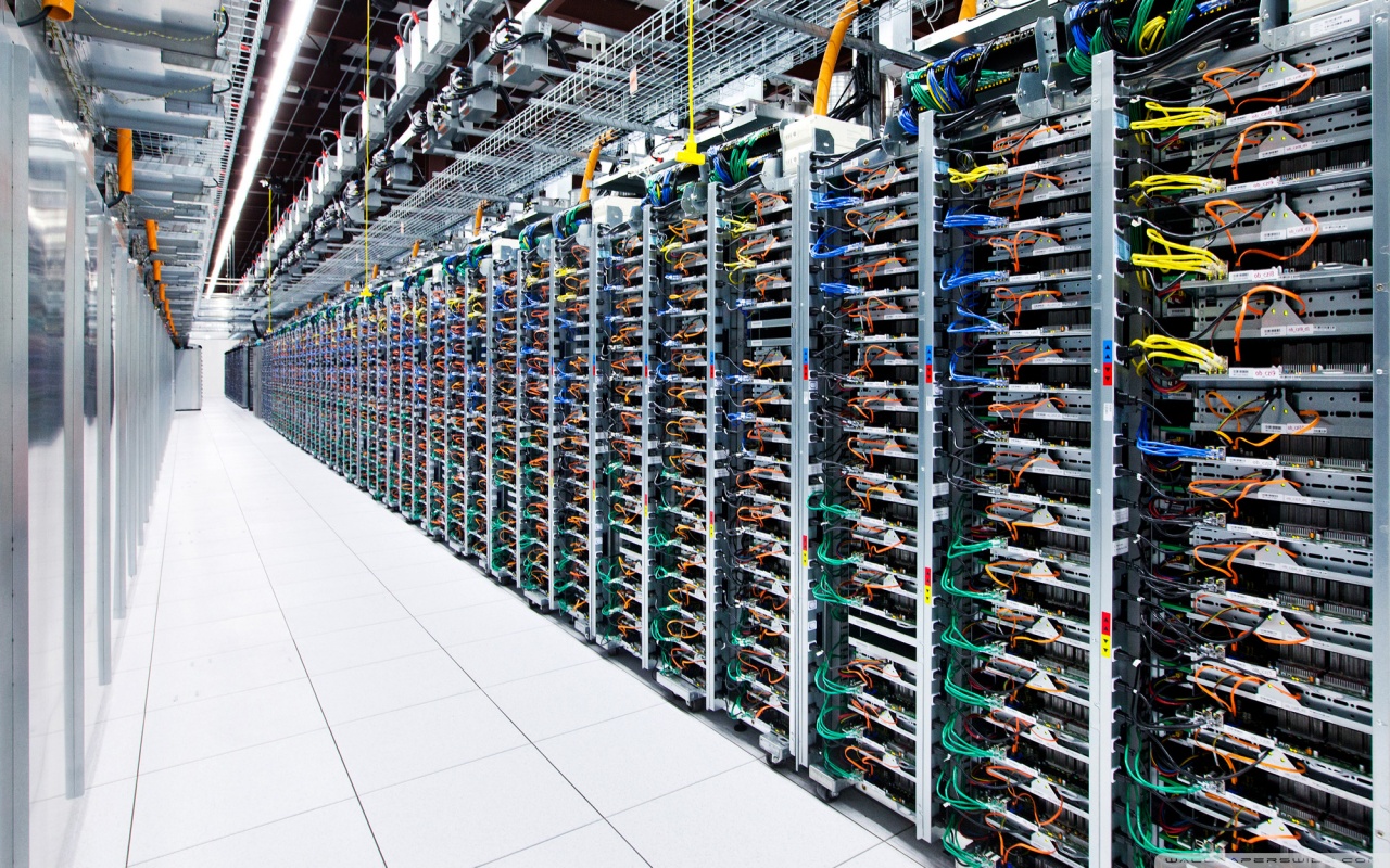 Description: A large server room with many racks of computers and wires on the wall and floor.