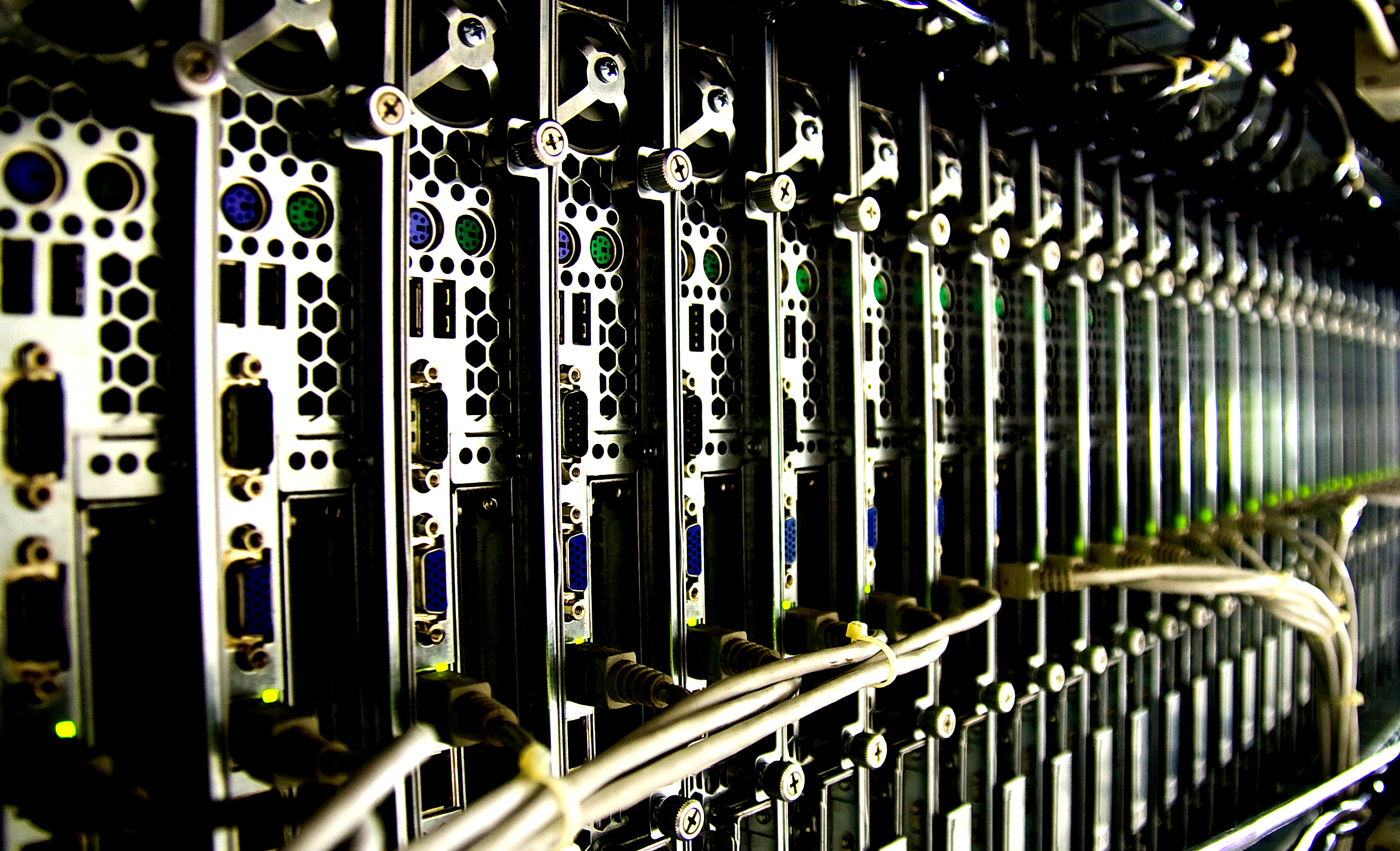 Description: A row of servers in a server room with wires running through them and a green light shining on the top.