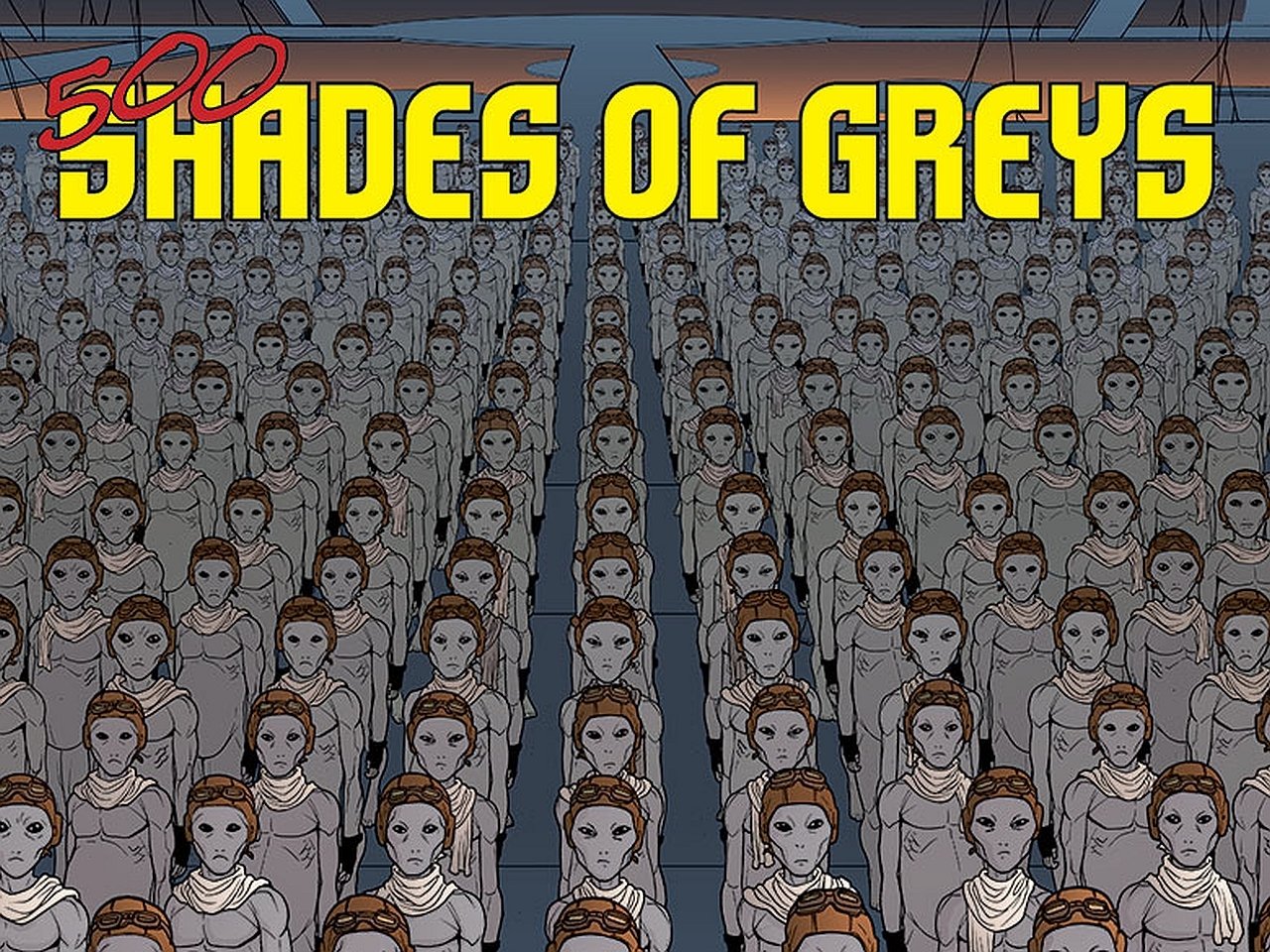 Description: A crowd of people with the words shades of greys on them in front of a yellow background with a red and black design.
