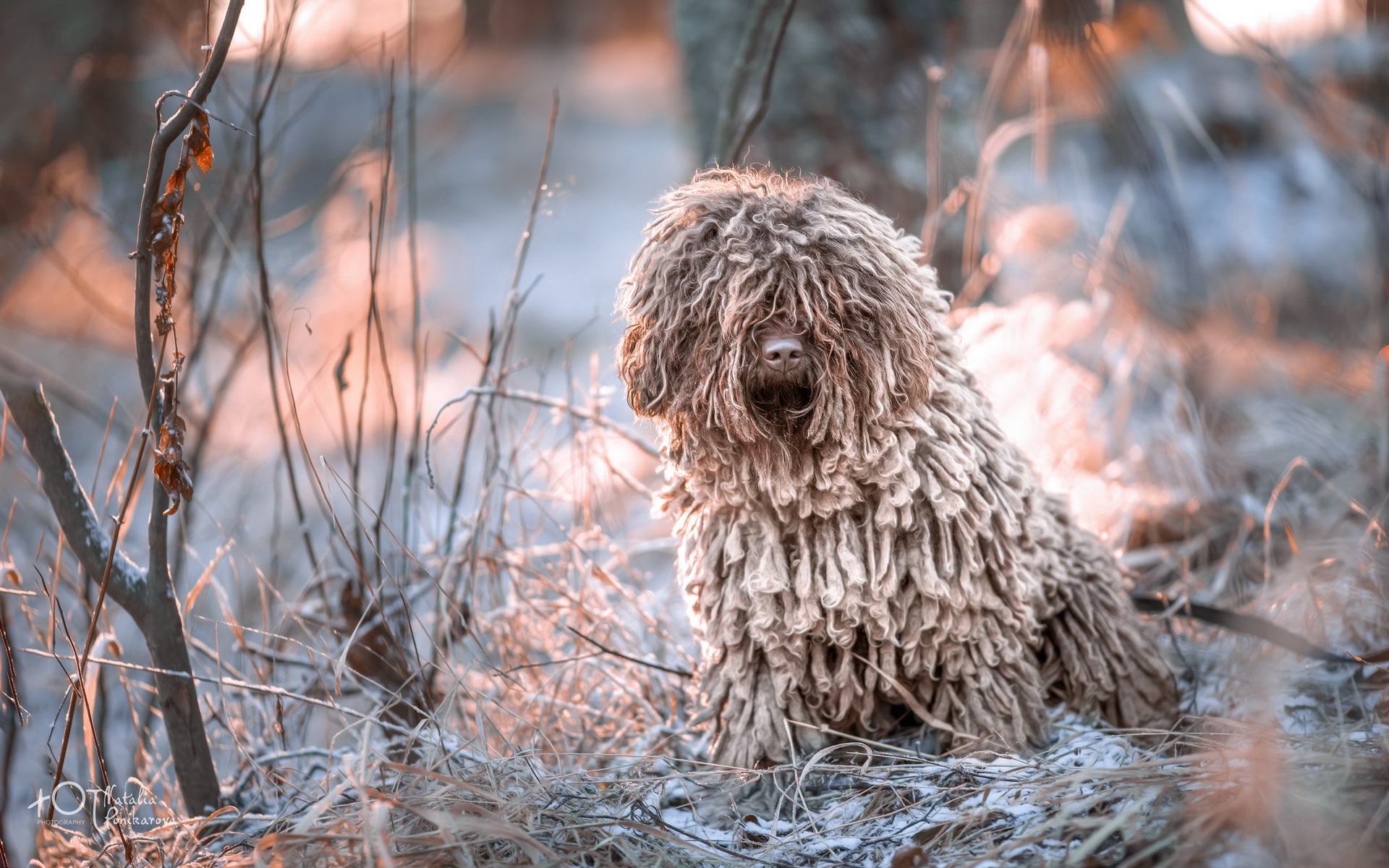 Description: A shaggy dog sitting in the middle of a forest filled with grass and trees.