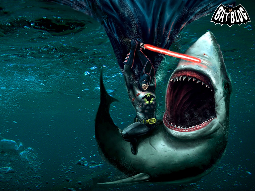 Description: A shark with a bat on its back and a man on it's back in the water with a sword.