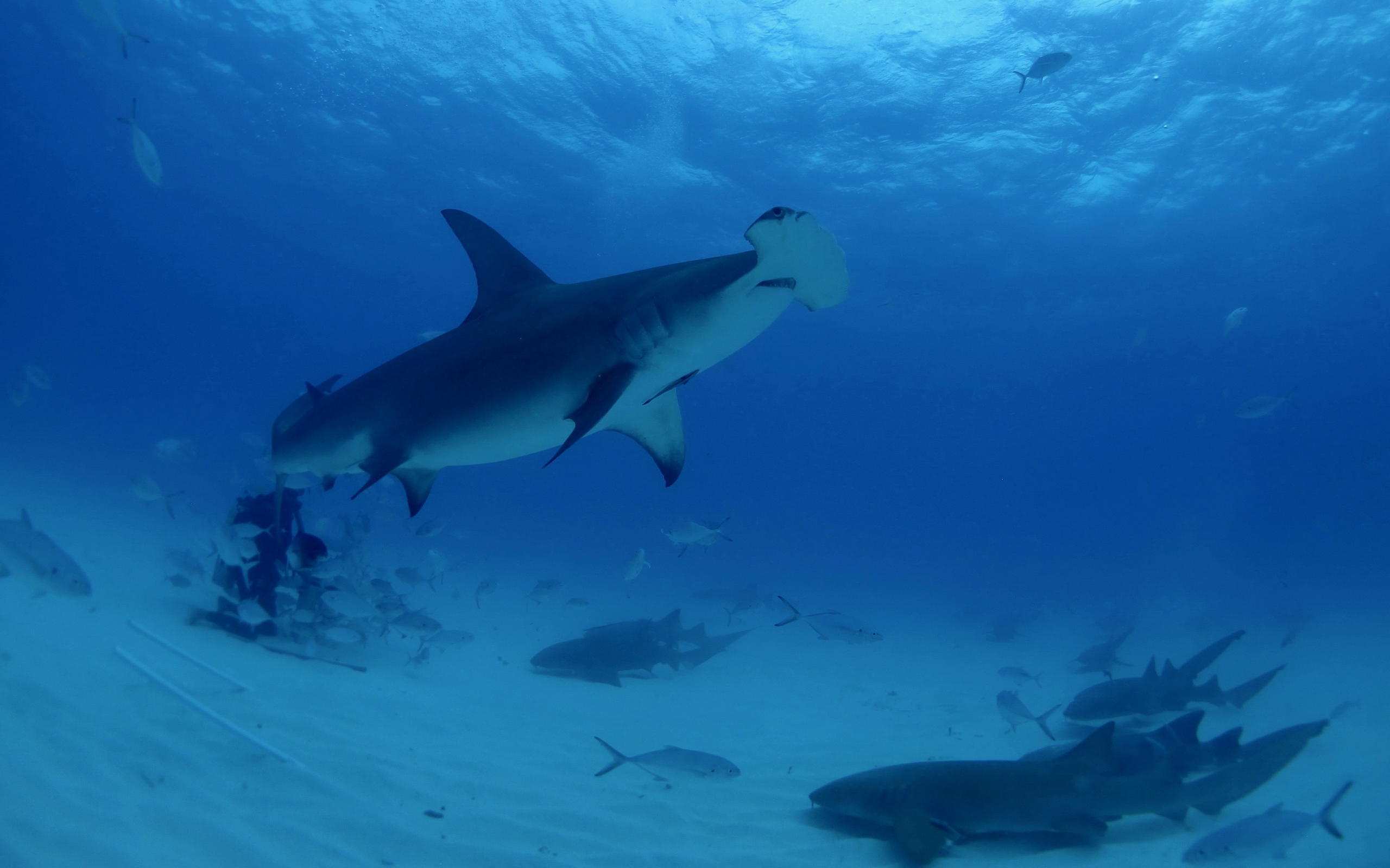 Description: A large shark swimming in the ocean with other fish around it and a diver in the background looking at it.