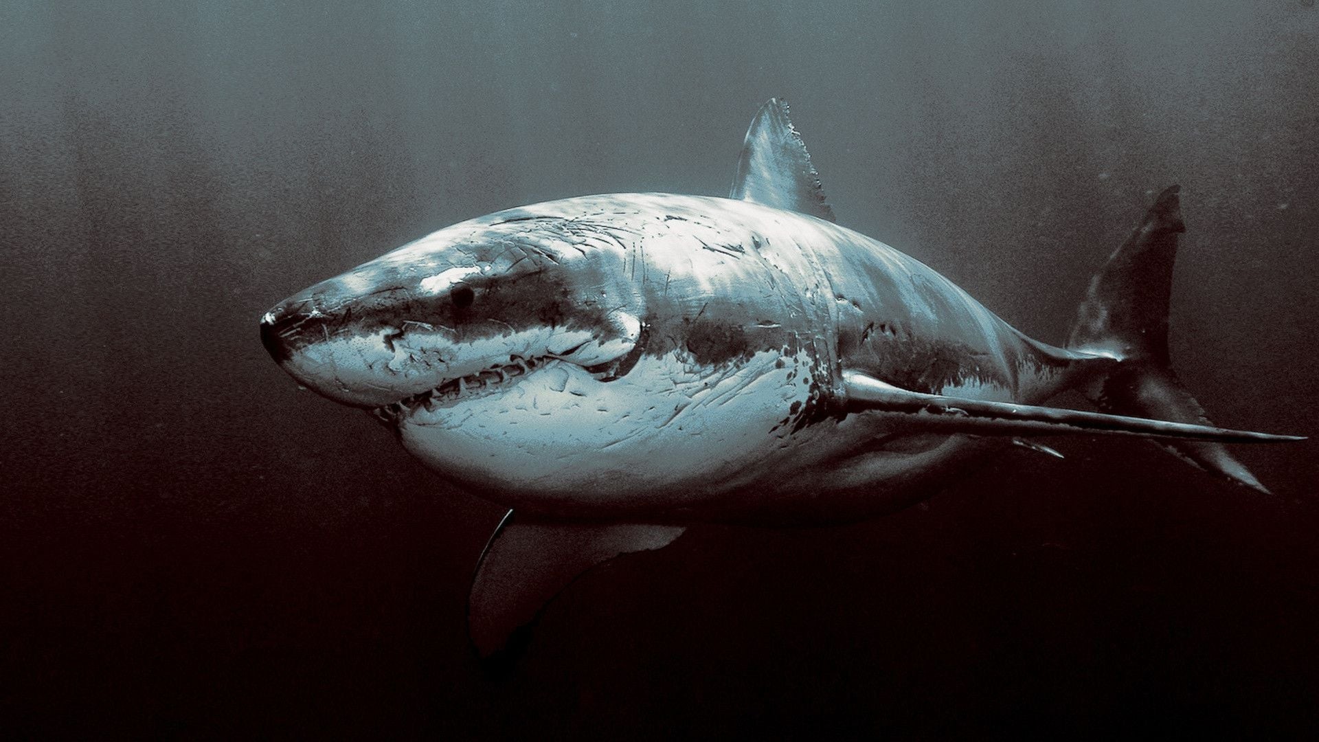 Description: A great white shark swimming in the ocean with a black background and a black and white photo of the shark.