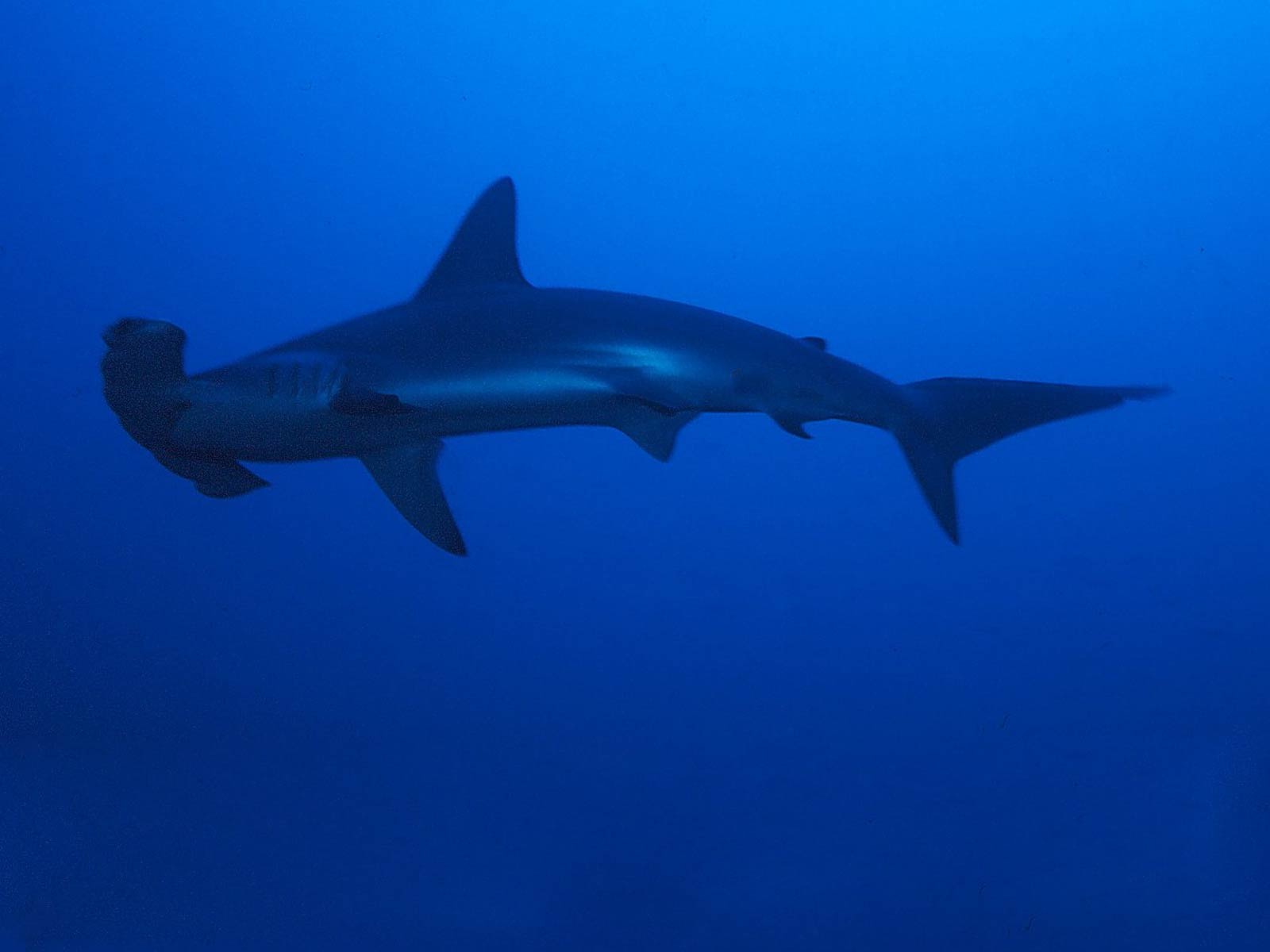Description: A shark swimming in the ocean with a scuba helmet on its head and a scuba mask on its mouth.