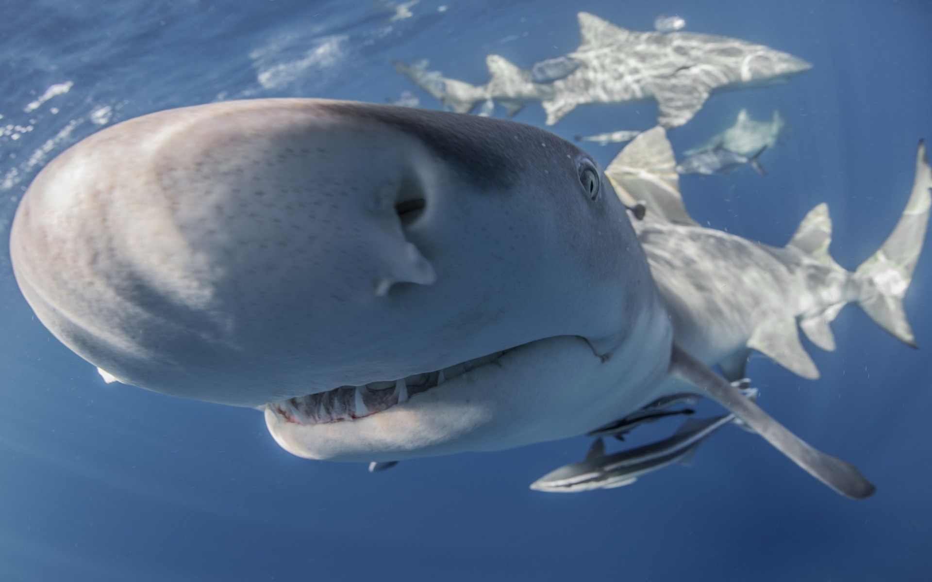 Description: A group of sharks swimming in the ocean together with a toothpick in its mouth and a toothpick in its mouth.