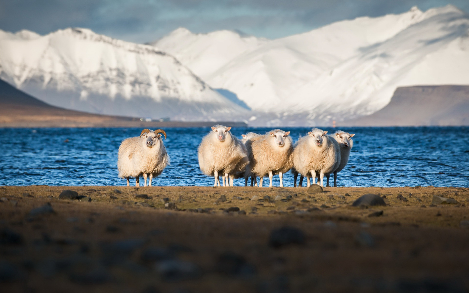 Description: A group of sheep standing on a beach next to a body of water with mountains in the background and snow covered mountains in the distance.