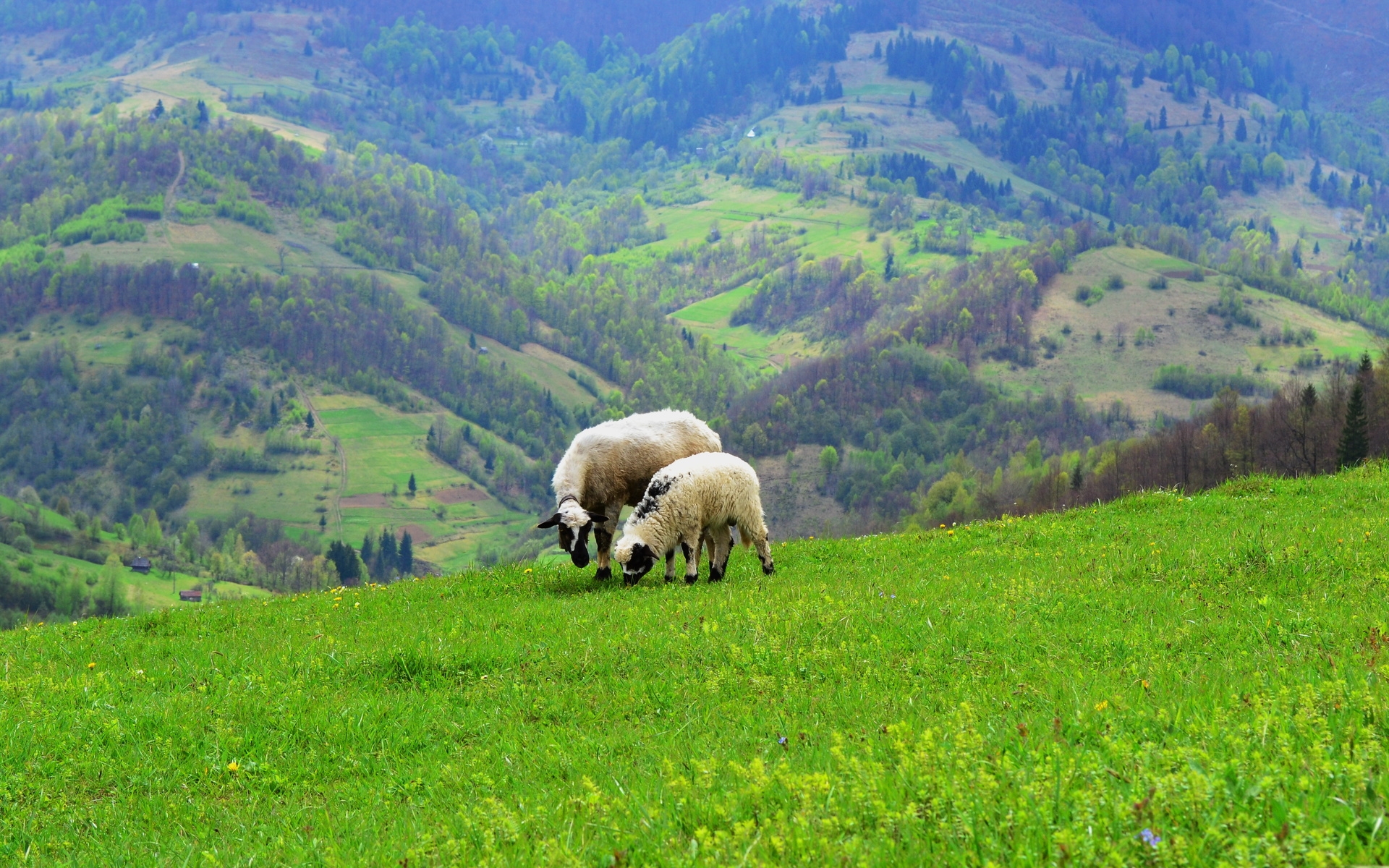 Description: Two sheep grazing on a lush green hillside with mountains in the background.