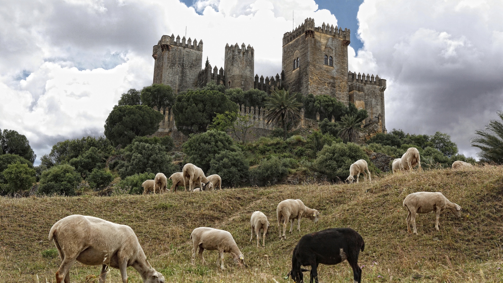 Description: A herd of sheep grazing on a lush green hillside next to a castle with a tall tower in the background.