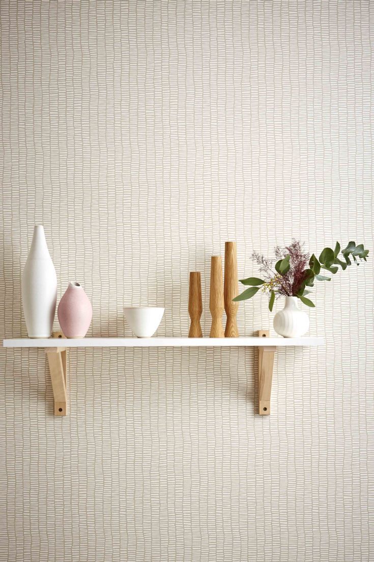 Description: A shelf with vases and other items on it against a wall with a wallpapered background behind it.