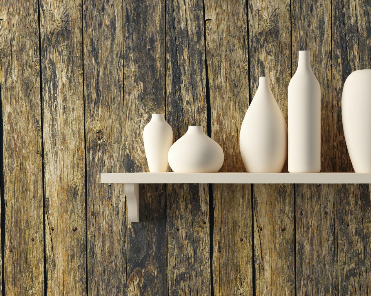 Description: A shelf with several white vases on it against a wooden wall with planks behind it and a wooden planked wall behind it.
