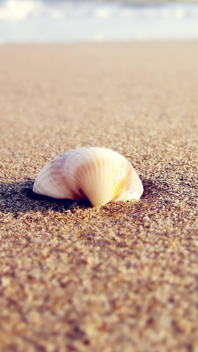 Description: A shell on the beach with the ocean in the background and a wave coming in from the ocean behind it.