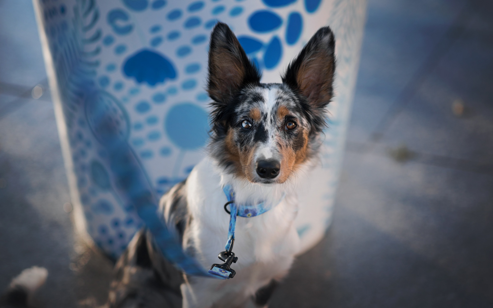 Description: A dog with a blue leash standing next to a water bottle with a paw print on it's side.