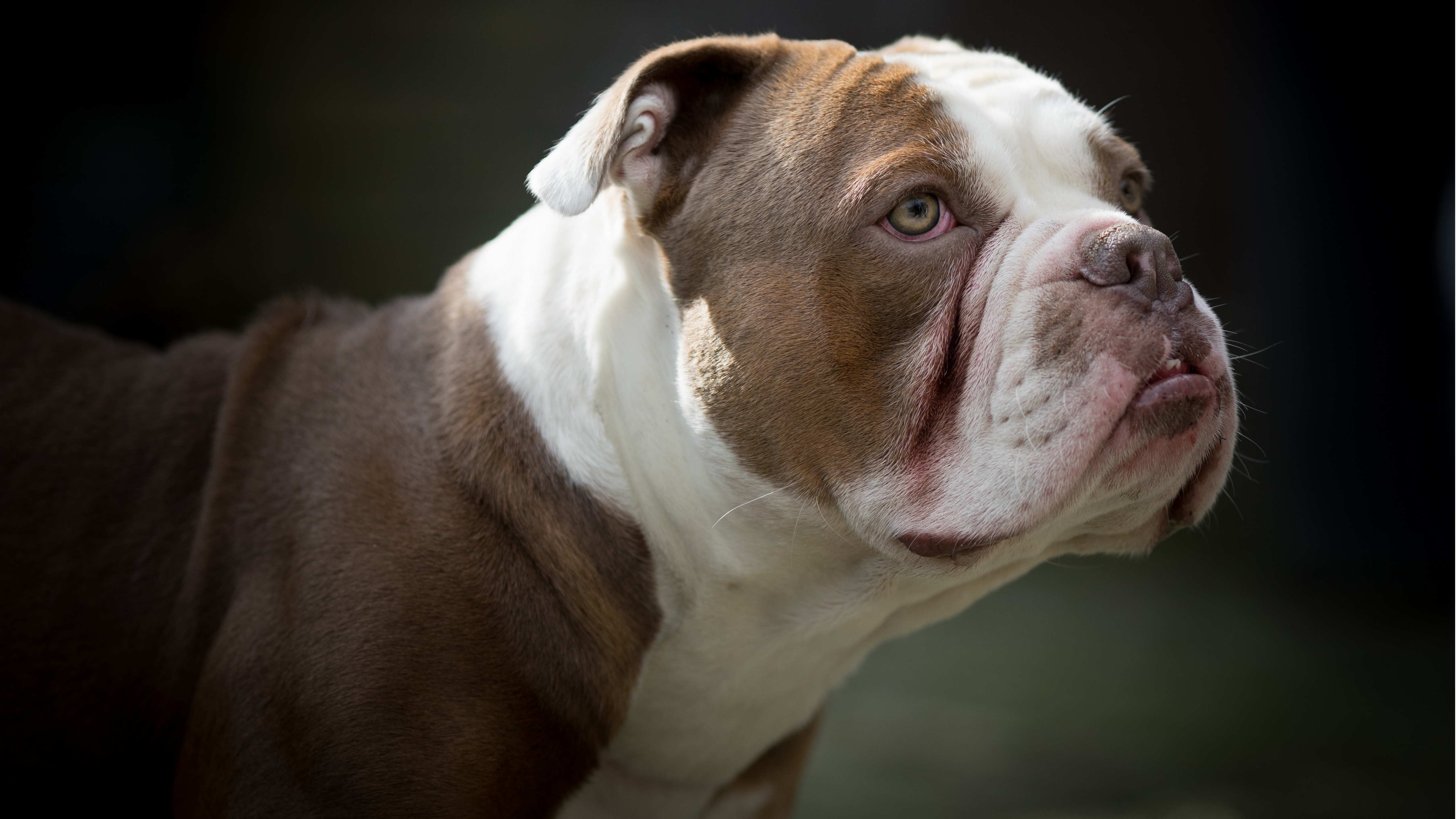 Description: A brown and white dog with a white spot on its face and a black background with a blurry background.