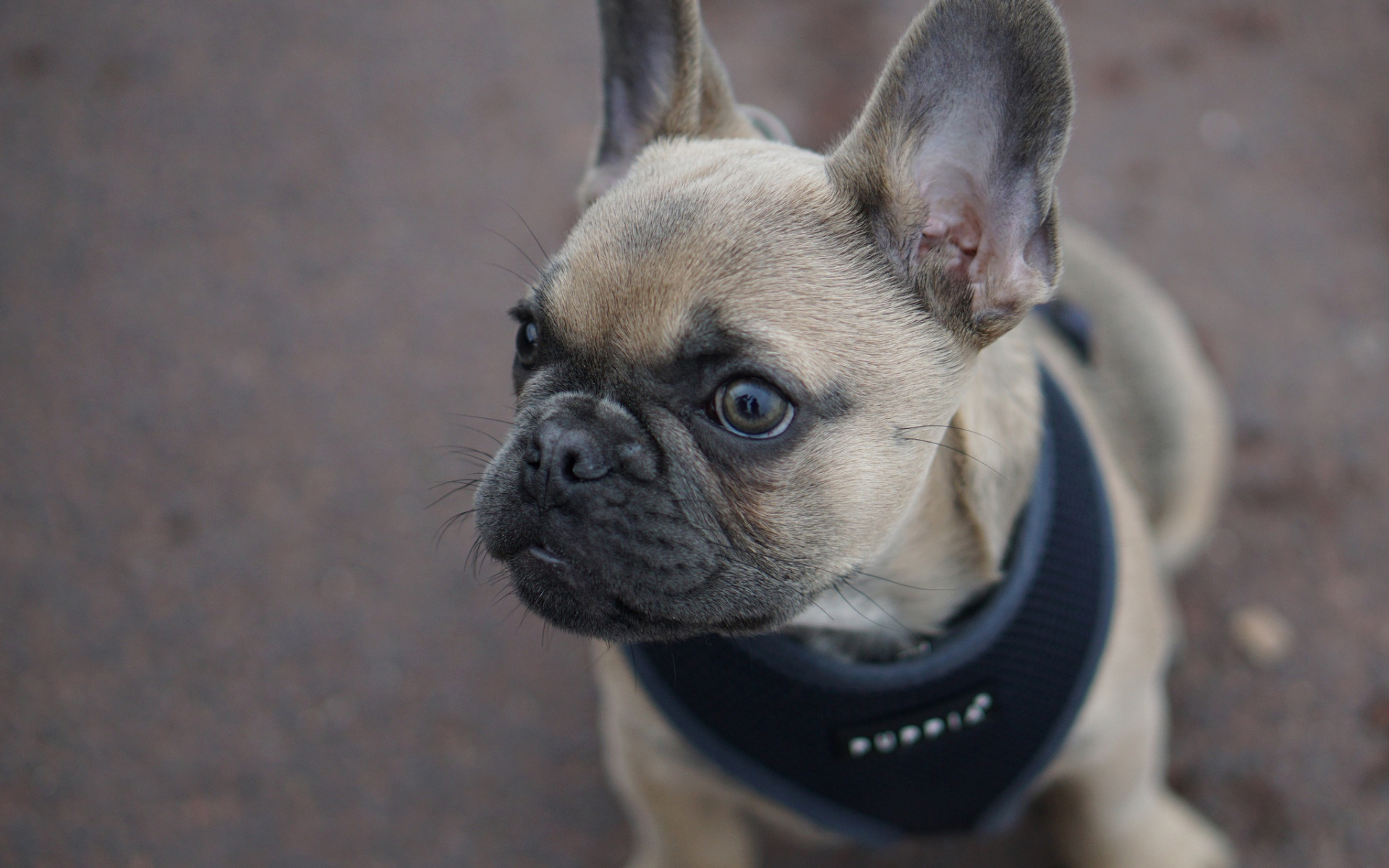 Description: A small dog with a collar on looking up at the camera while standing on a sidewalk with a brick surface.