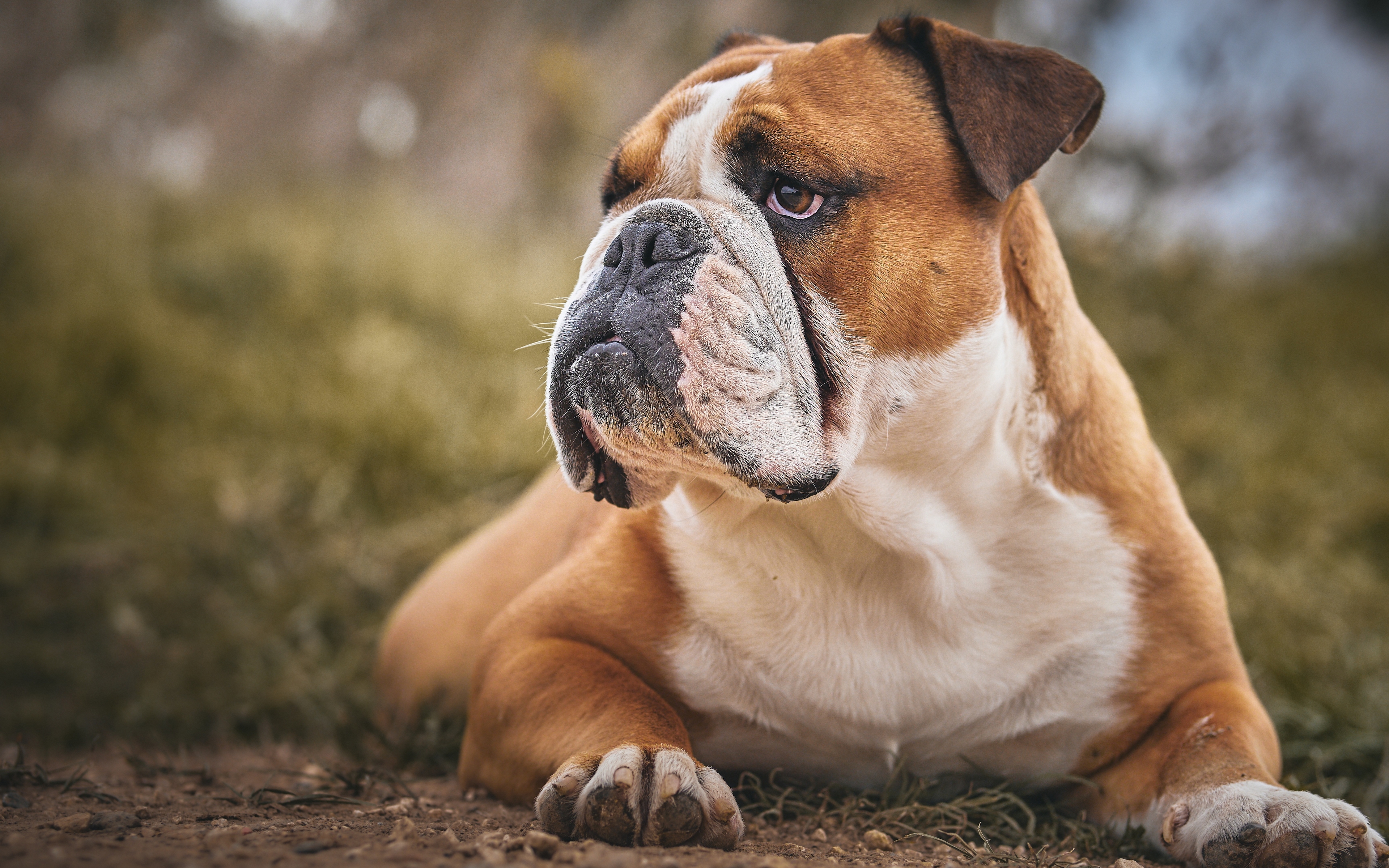 Description: A brown and white dog laying on top of a grass covered field next to a forest of trees and bushes.