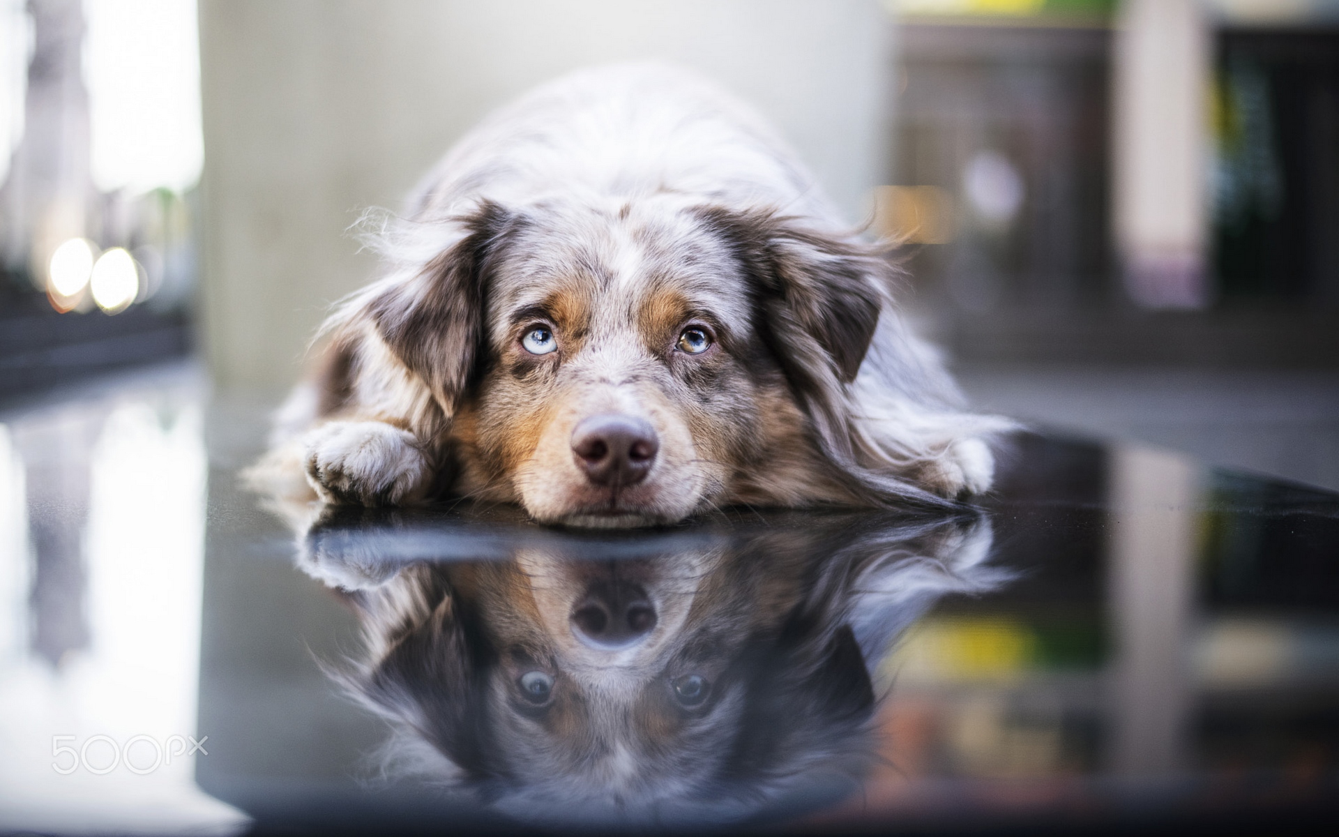 Description: A dog laying on a table with its head on the table top looking at the camera with its eyes closed.