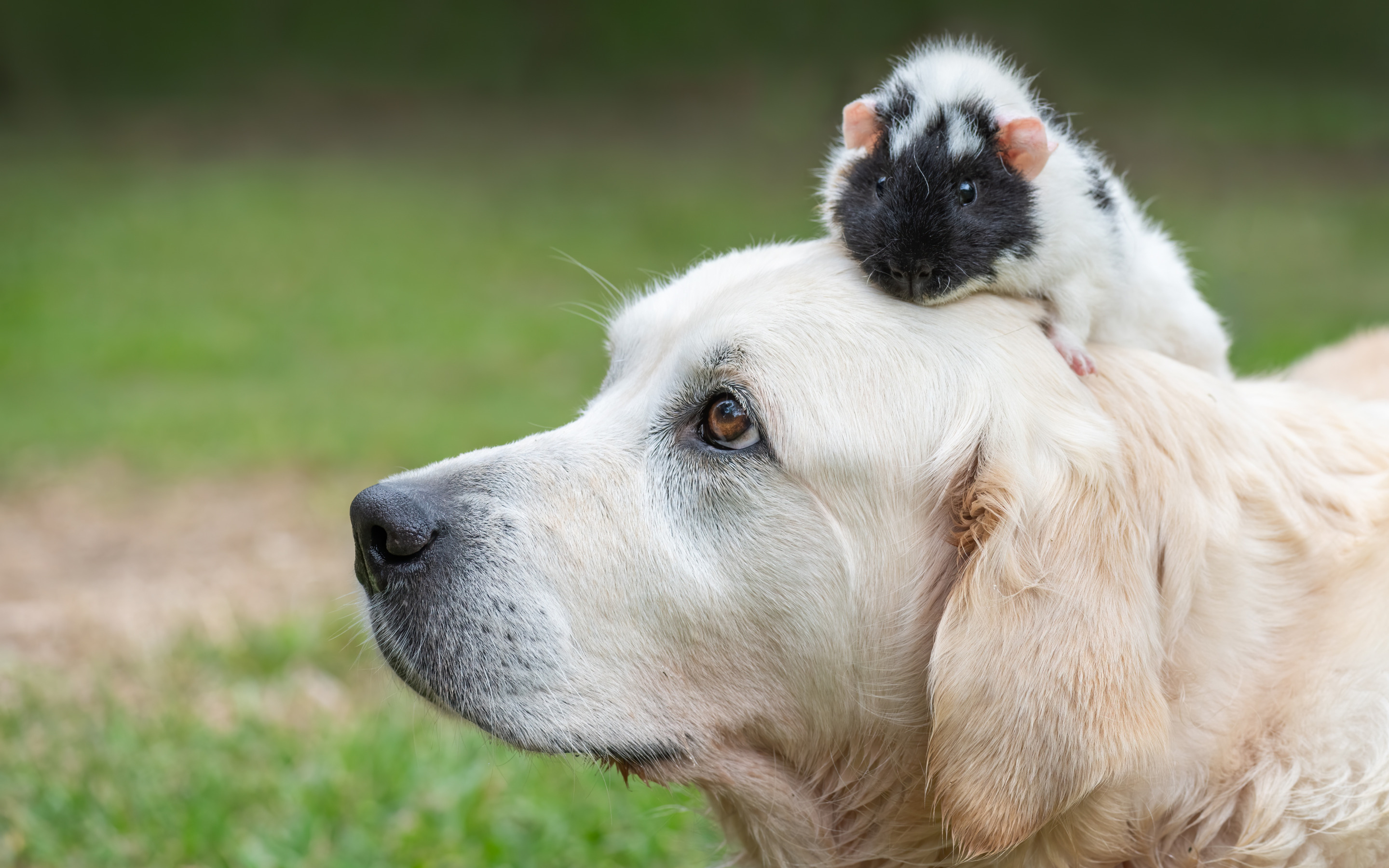 Description: A dog with a black and white rat on its back on its head in the grass of a park.