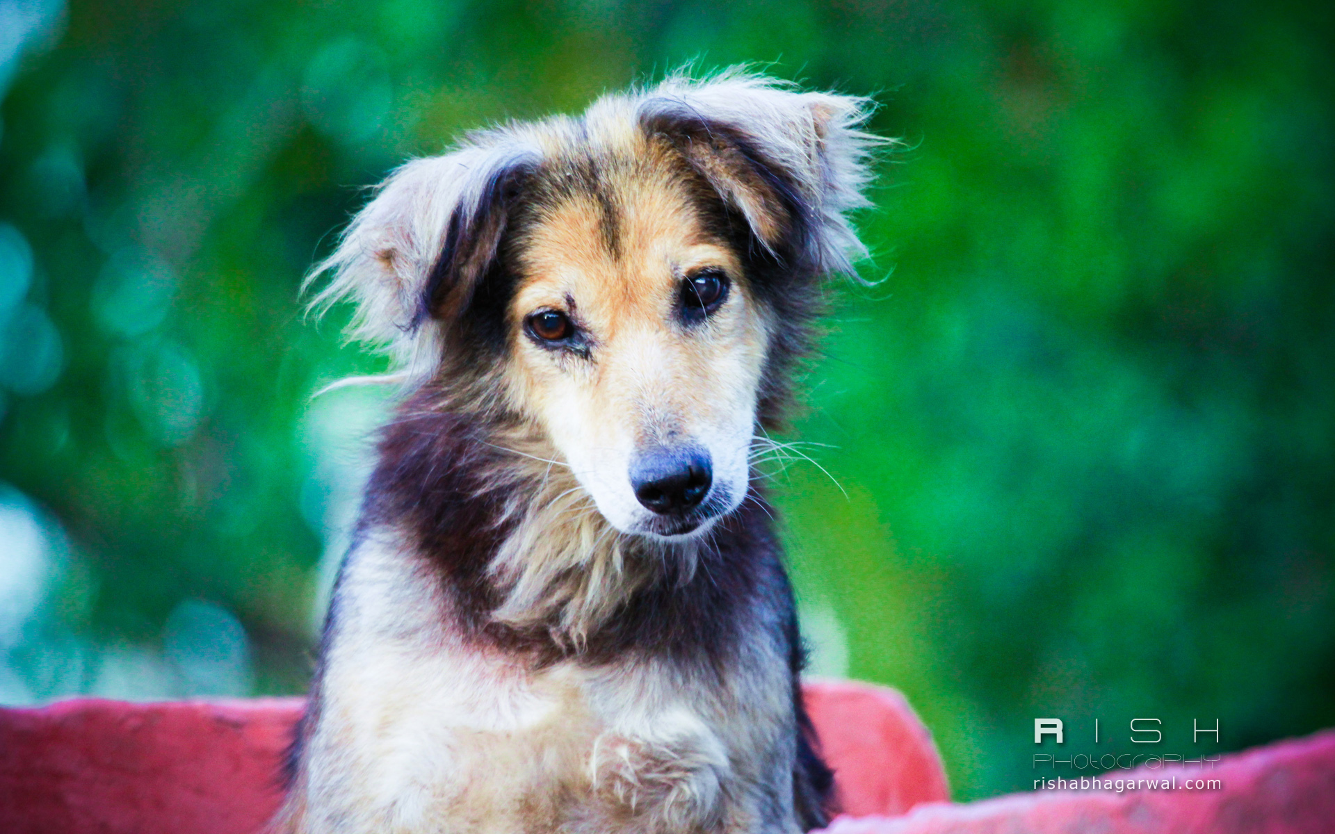 Description: A dog sitting in a red bowl outside in the sun with a blurry background of trees and bushes.