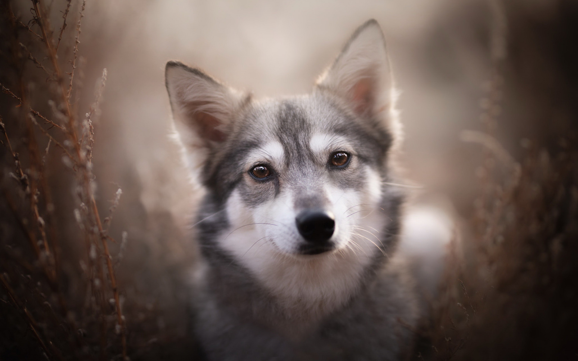 Description: A dog is looking at the camera while standing in a field of grass and weeds with a blurry background.