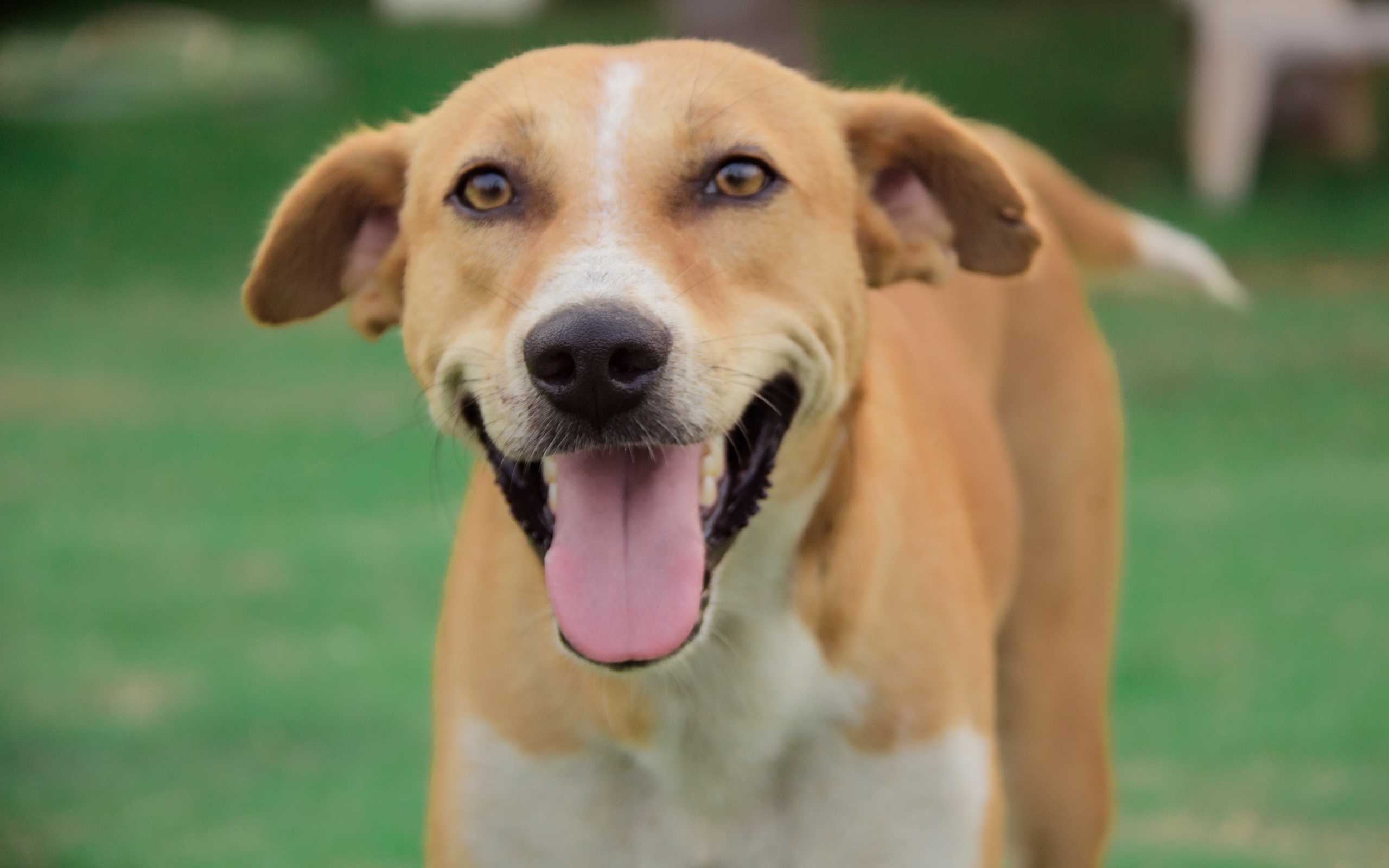 Description: A dog with its mouth open and it's tongue out in the grass with a white dog in the background.