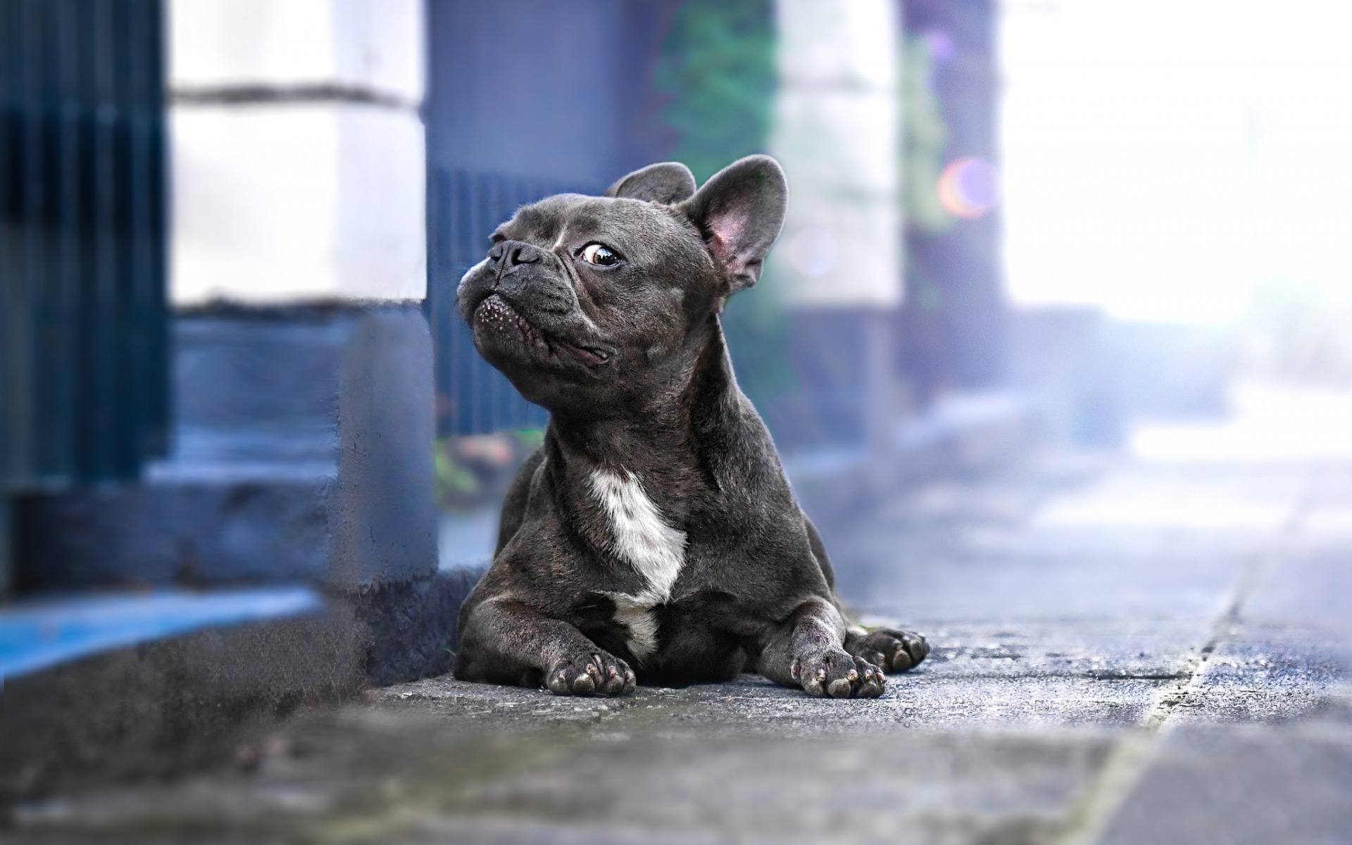 Description: A small dog sitting on the sidewalk looking up at something in the air with a sad look on its face.