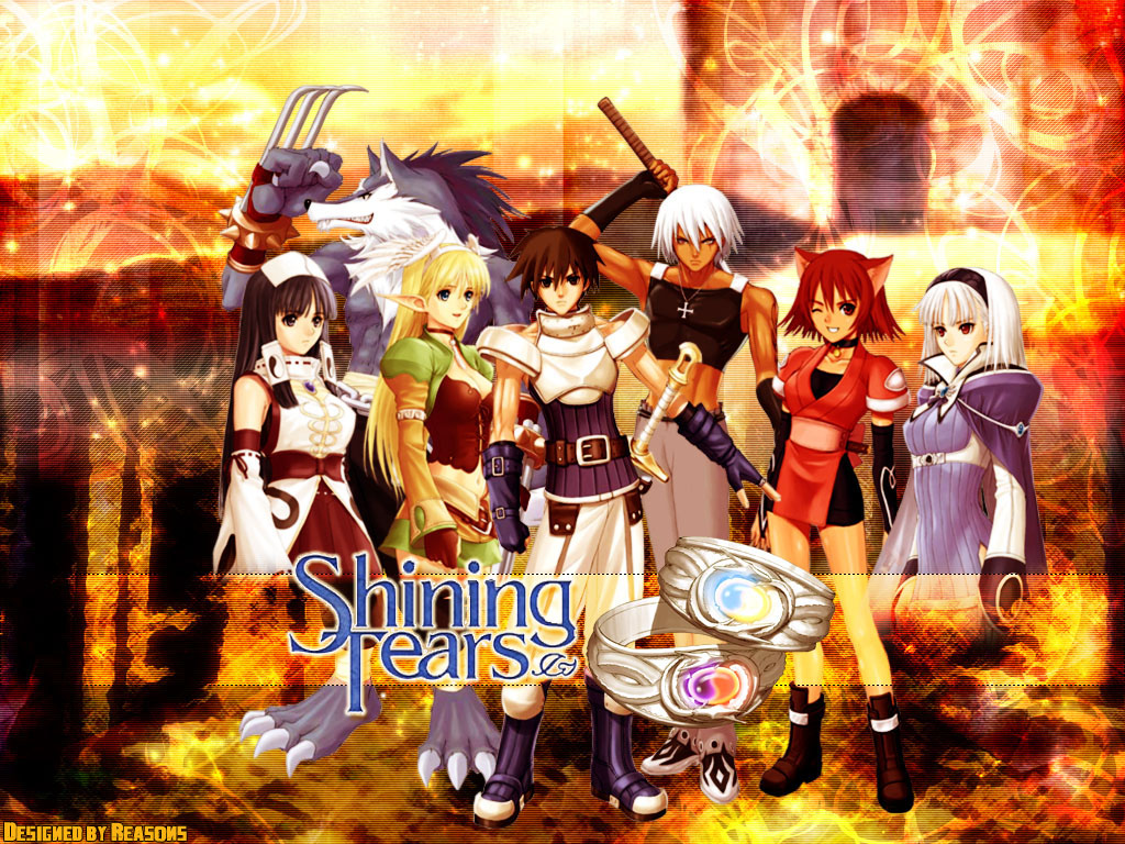 Description: A group of anime characters standing in front of a fire background with the words shining tears on it's side.