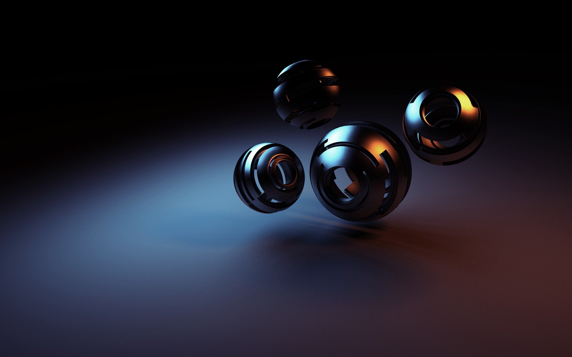 Description: A group of three shiny metal objects on a black background with a red and blue light behind them and a black background with a red and blue light.
