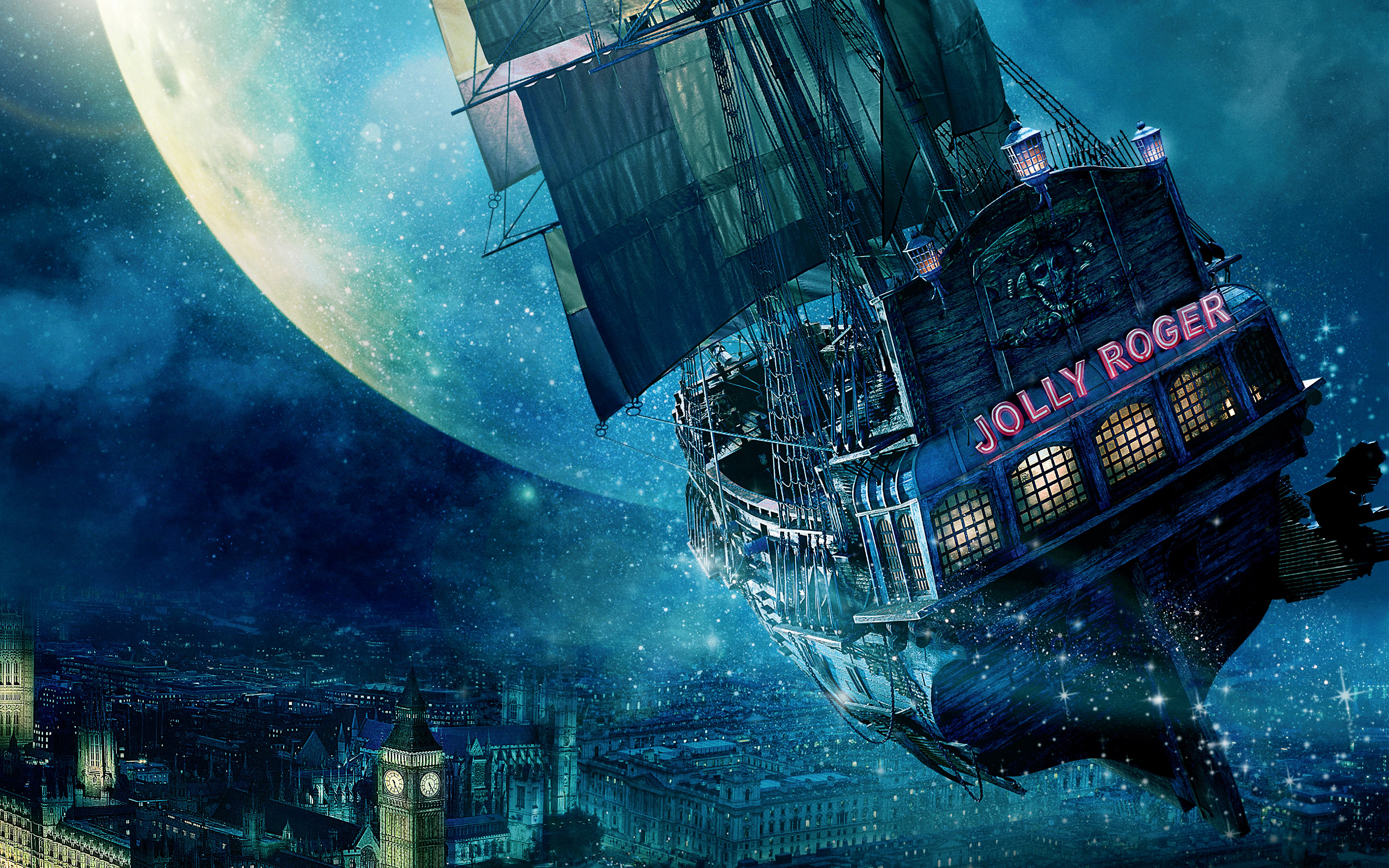 Description: A ship floating in the air with a full moon in the background and a city below it with a clock tower.