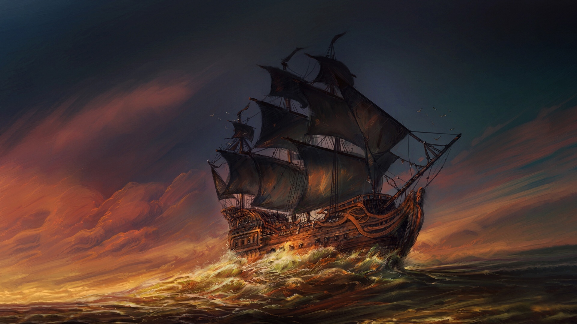 Description: A painting of a ship in the ocean with a sky background and clouds in the background.