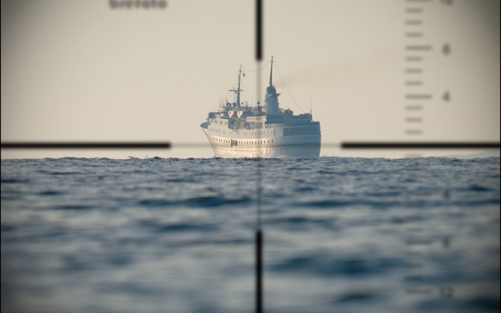Description: A ship is seen through a scope on the water near a beach area with a ruler in the foreground.