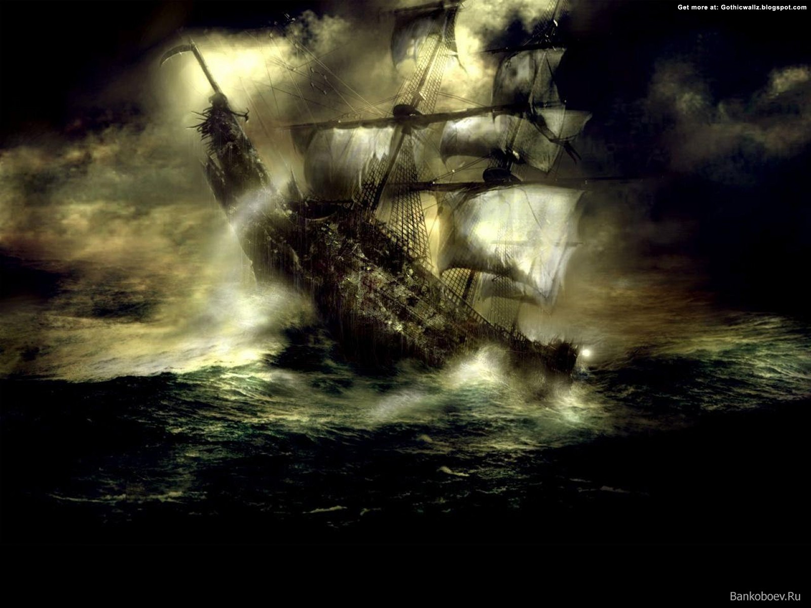 Description: A ship in the middle of a storm with a sky background and clouds above it.